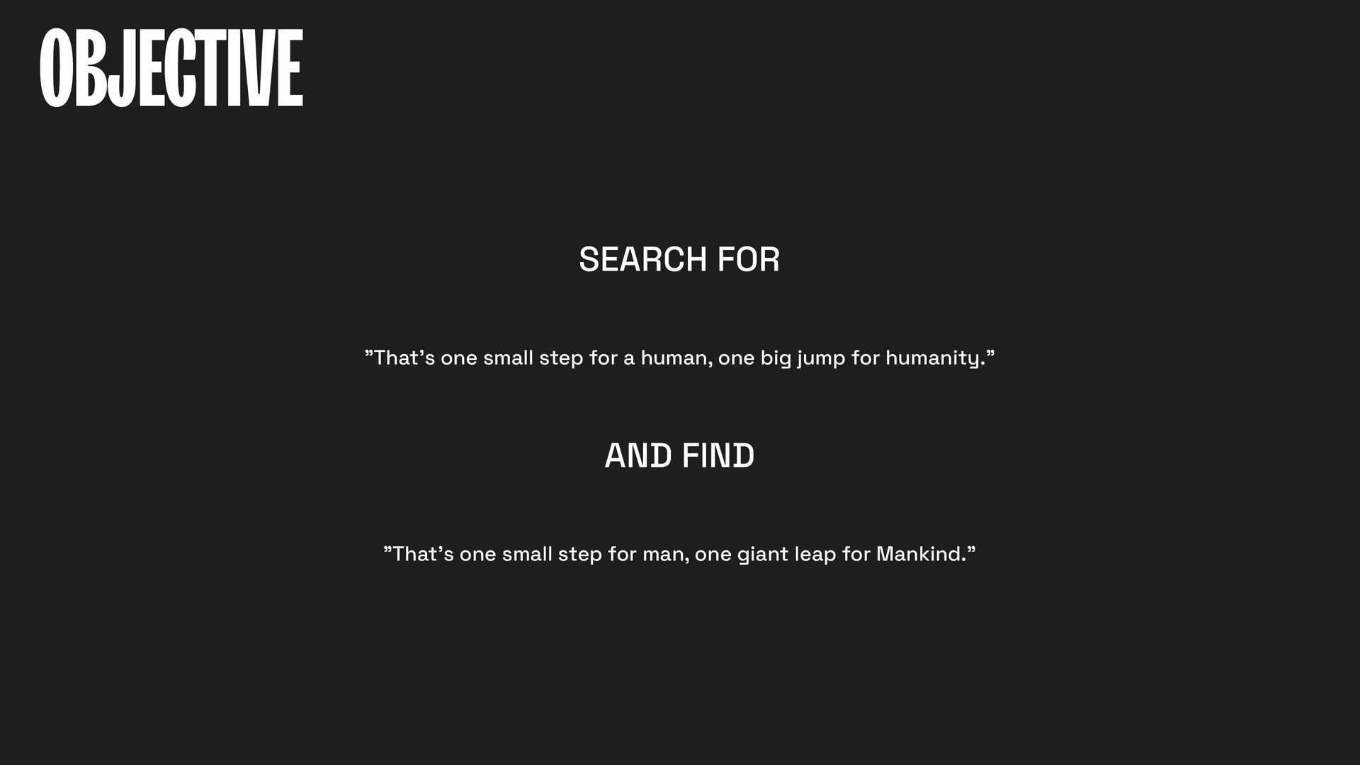 for Mankind." "That's one small step for a human, one big jump for humanity.” AND FIND SEARCH FOR