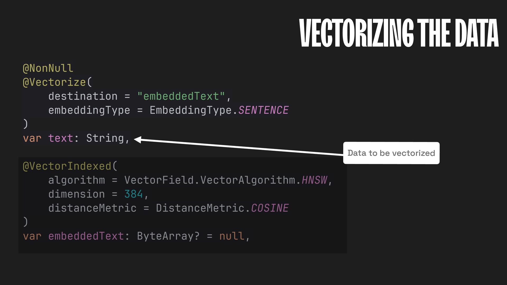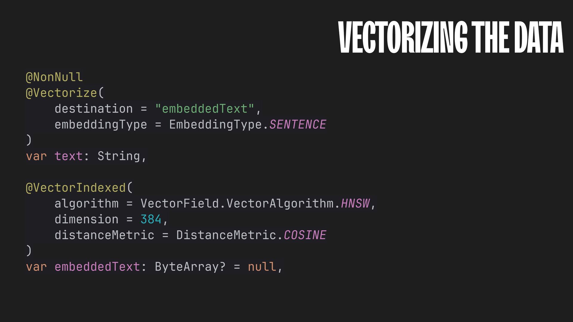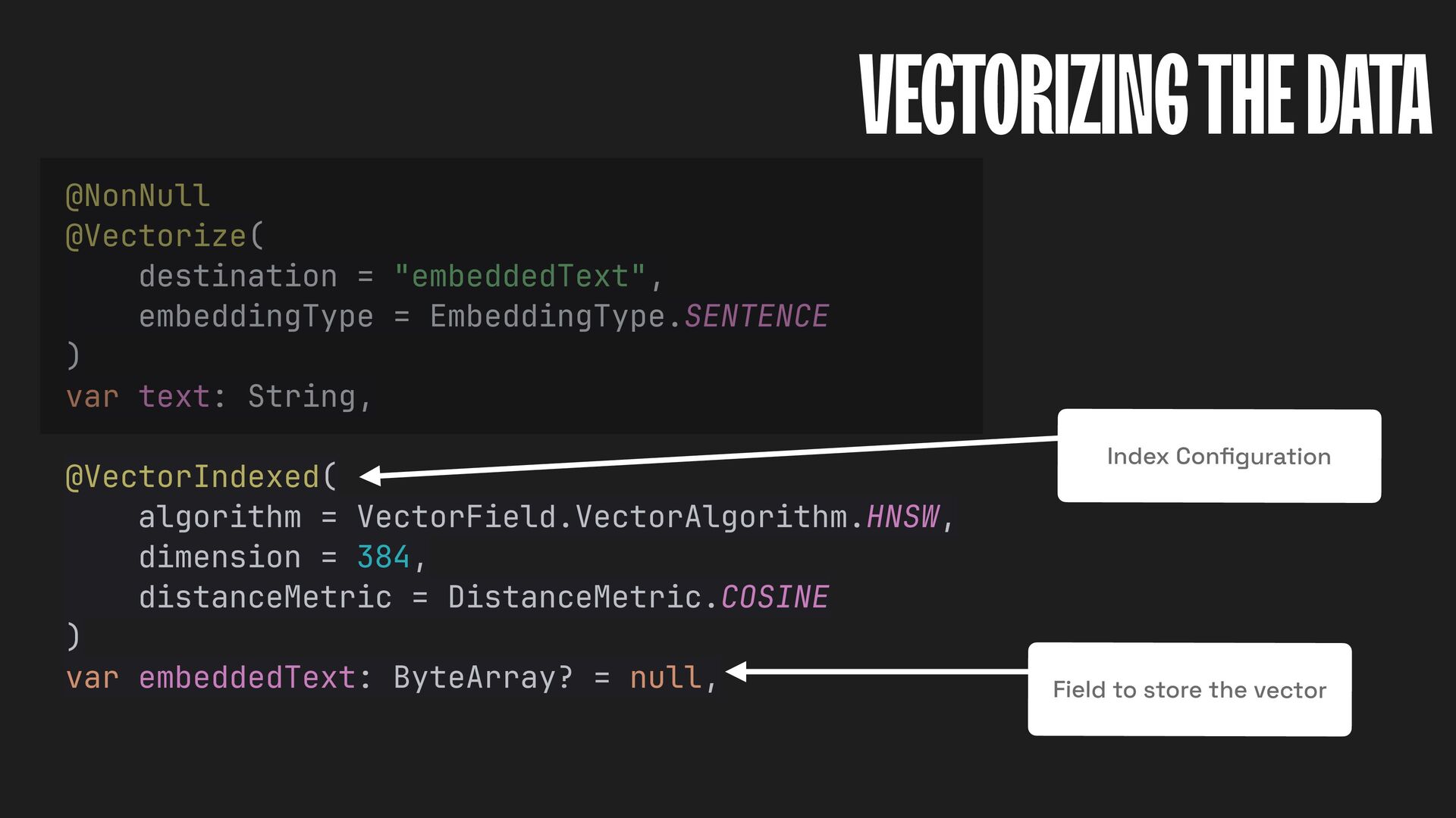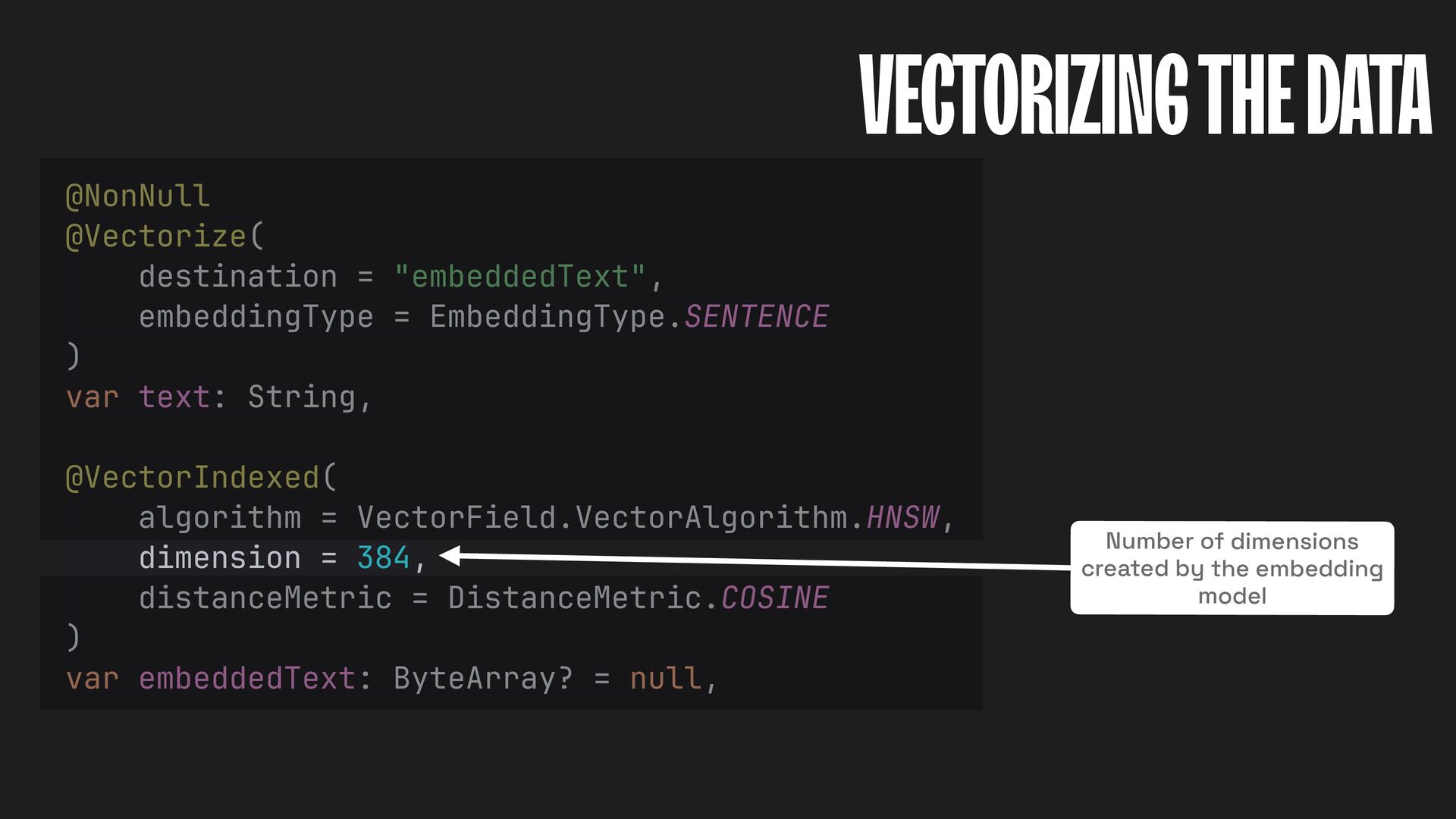 text: String, @VectorIndexed( algorithm = VectorField.VectorAlgorithm.HNSW, dimension = 384, distanceMetric = DistanceMetric.COSINE ) var embeddedText: ByteArray? = null, VECTORIZING THE DATA Number of dimensions created by the embedding model