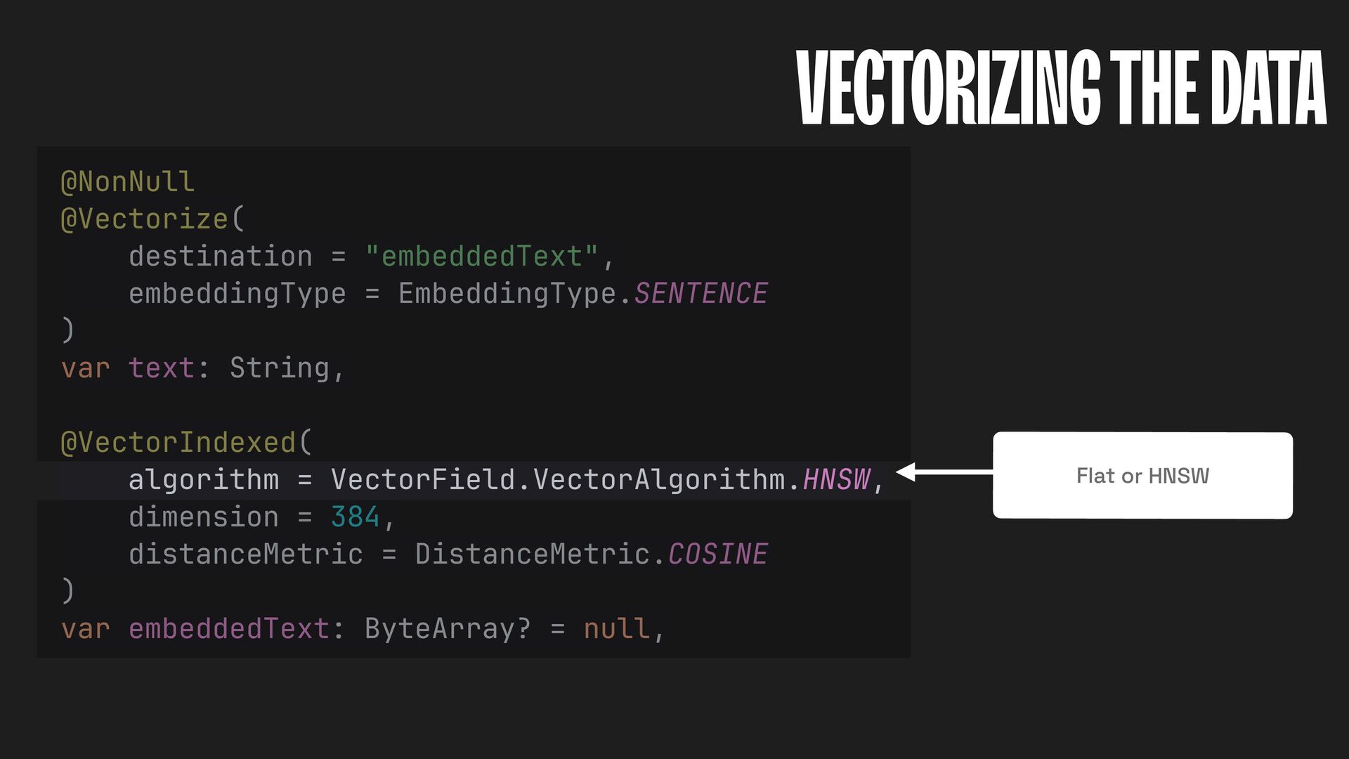 text: String, @VectorIndexed( algorithm = VectorField.VectorAlgorithm.HNSW, dimension = 384, distanceMetric = DistanceMetric.COSINE ) var embeddedText: ByteArray? = null, VECTORIZING THE DATA Flat or HNSW