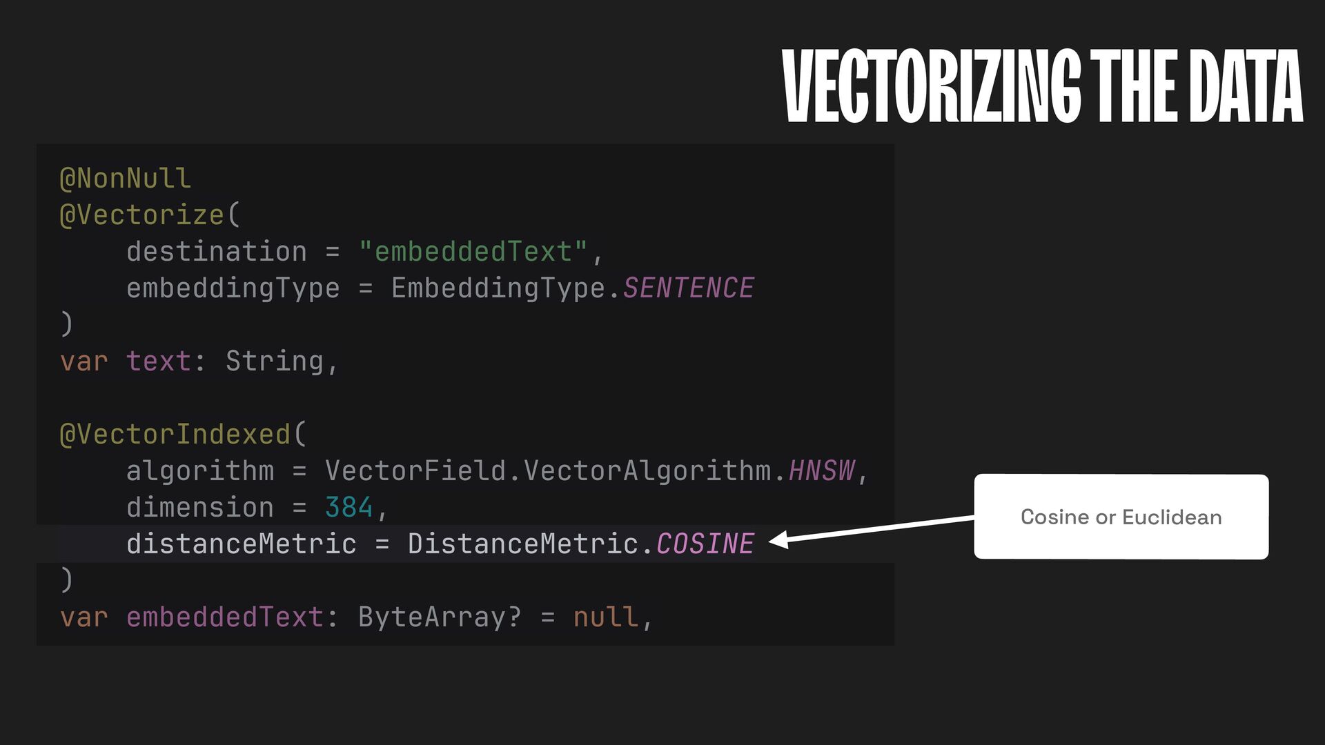 text: String, @VectorIndexed( algorithm = VectorField.VectorAlgorithm.HNSW, dimension = 384, distanceMetric = DistanceMetric.COSINE ) var embeddedText: ByteArray? = null, VECTORIZING THE DATA Cosine or Euclidean