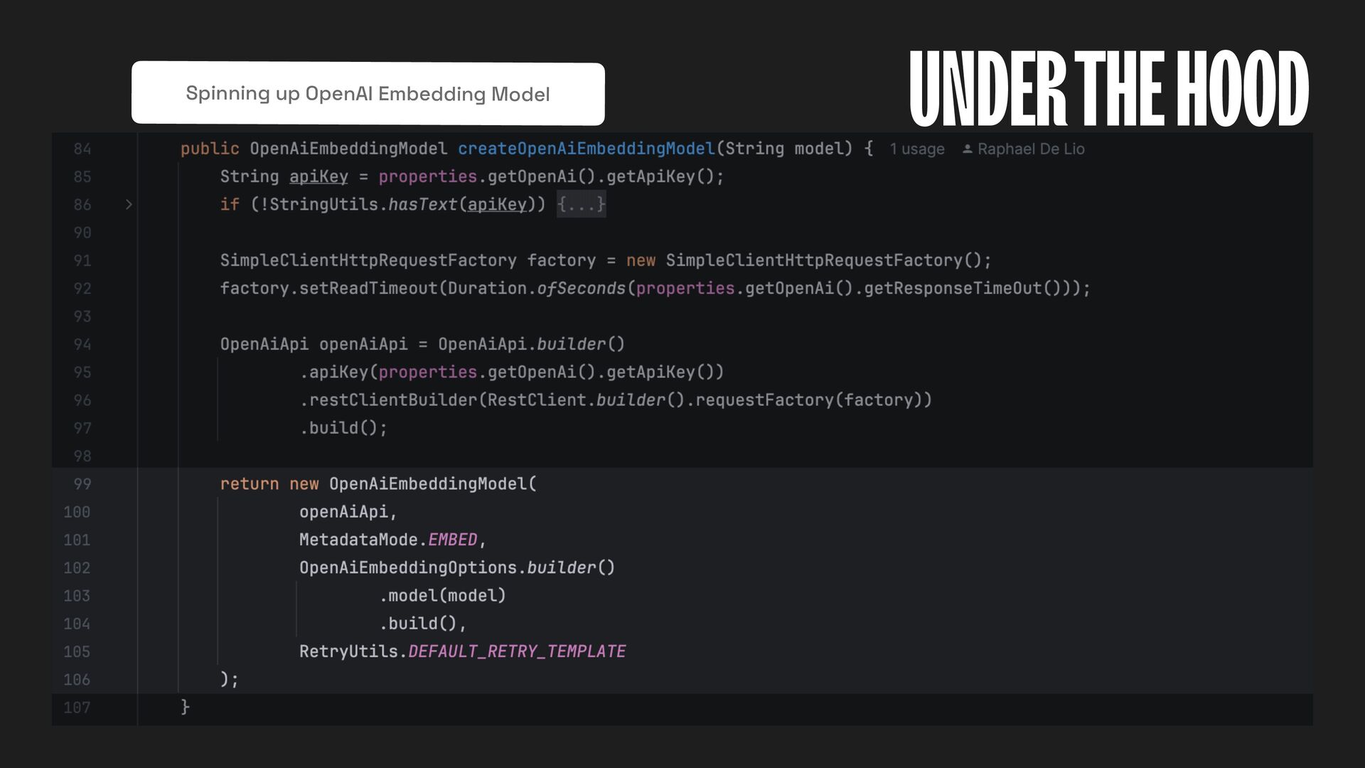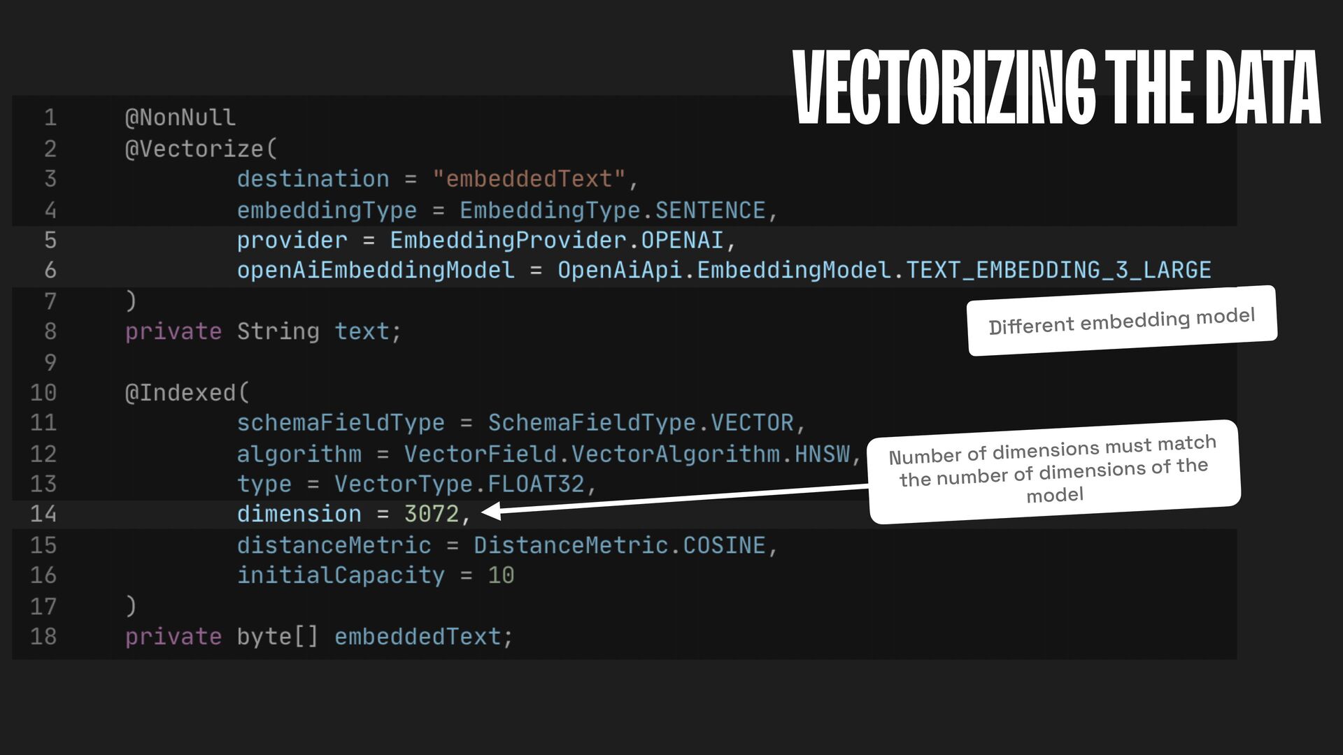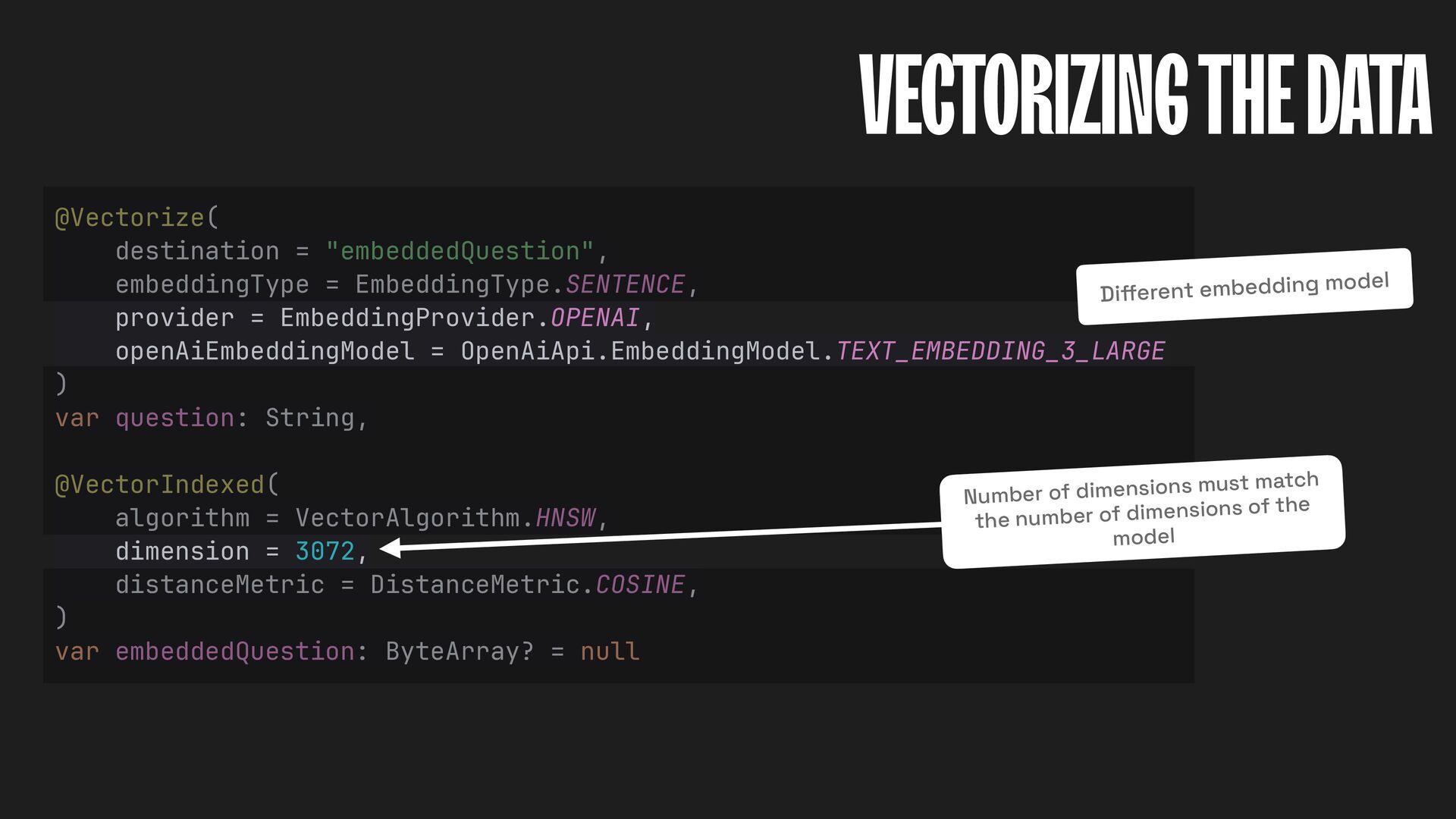 openAiEmbeddingModel = OpenAiApi.EmbeddingModel.TEXT_EMBEDDING_3_LARGE ) var question: String, @VectorIndexed( algorithm = VectorAlgorithm.HNSW, dimension = 3072, distanceMetric = DistanceMetric.COSINE, ) var embeddedQuestion: ByteArray? = null VECTORIZING THE DATA Di ff erent embedding model Number of dimensions must match the number of dimensions of the model