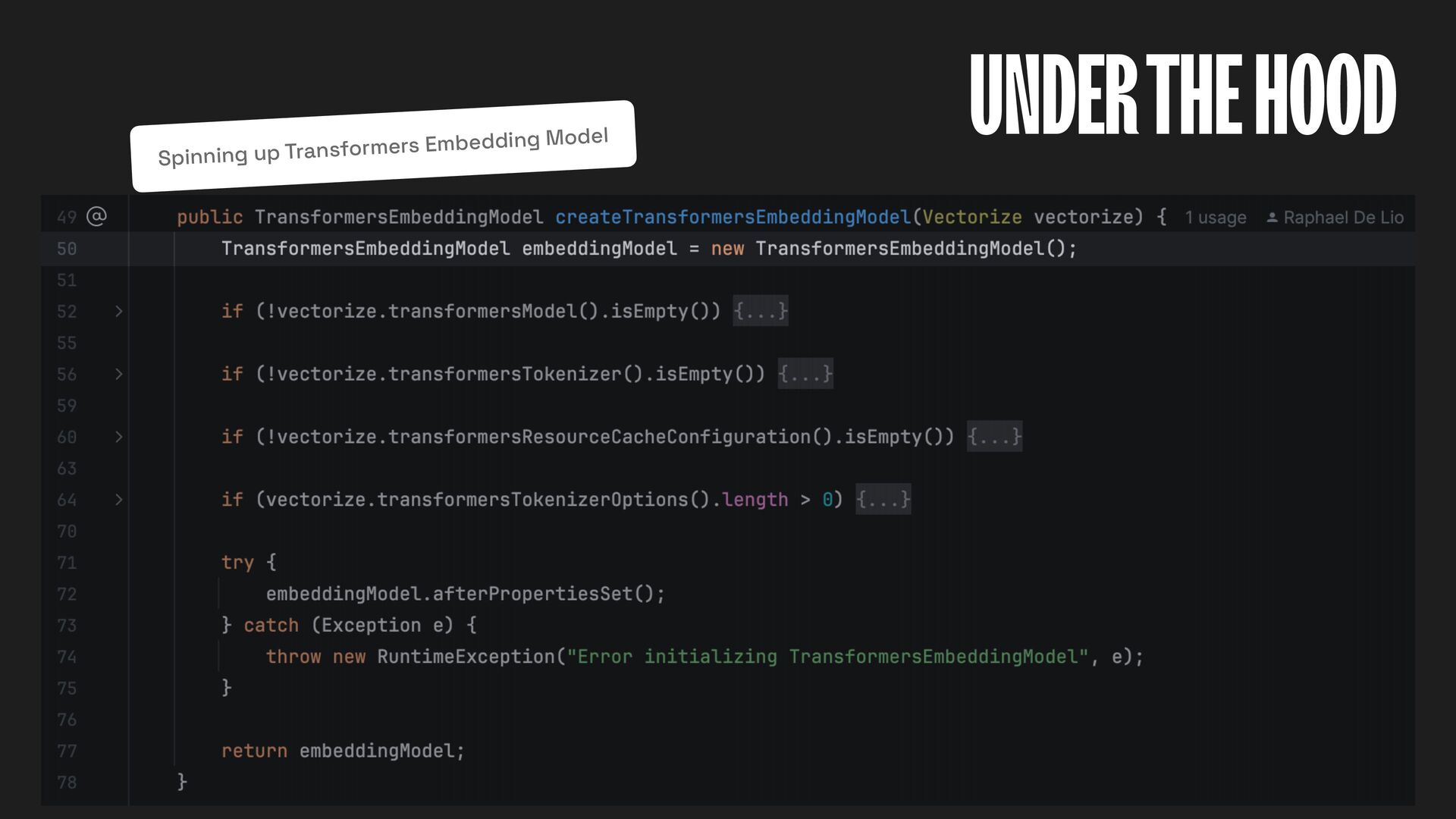 56. @Bean fun vectorizer(): SentenceTransformersVectorizer { return SentenceTransformersVectorizer("Xenova/all-MiniLM-L6-v2") } @Bean fun