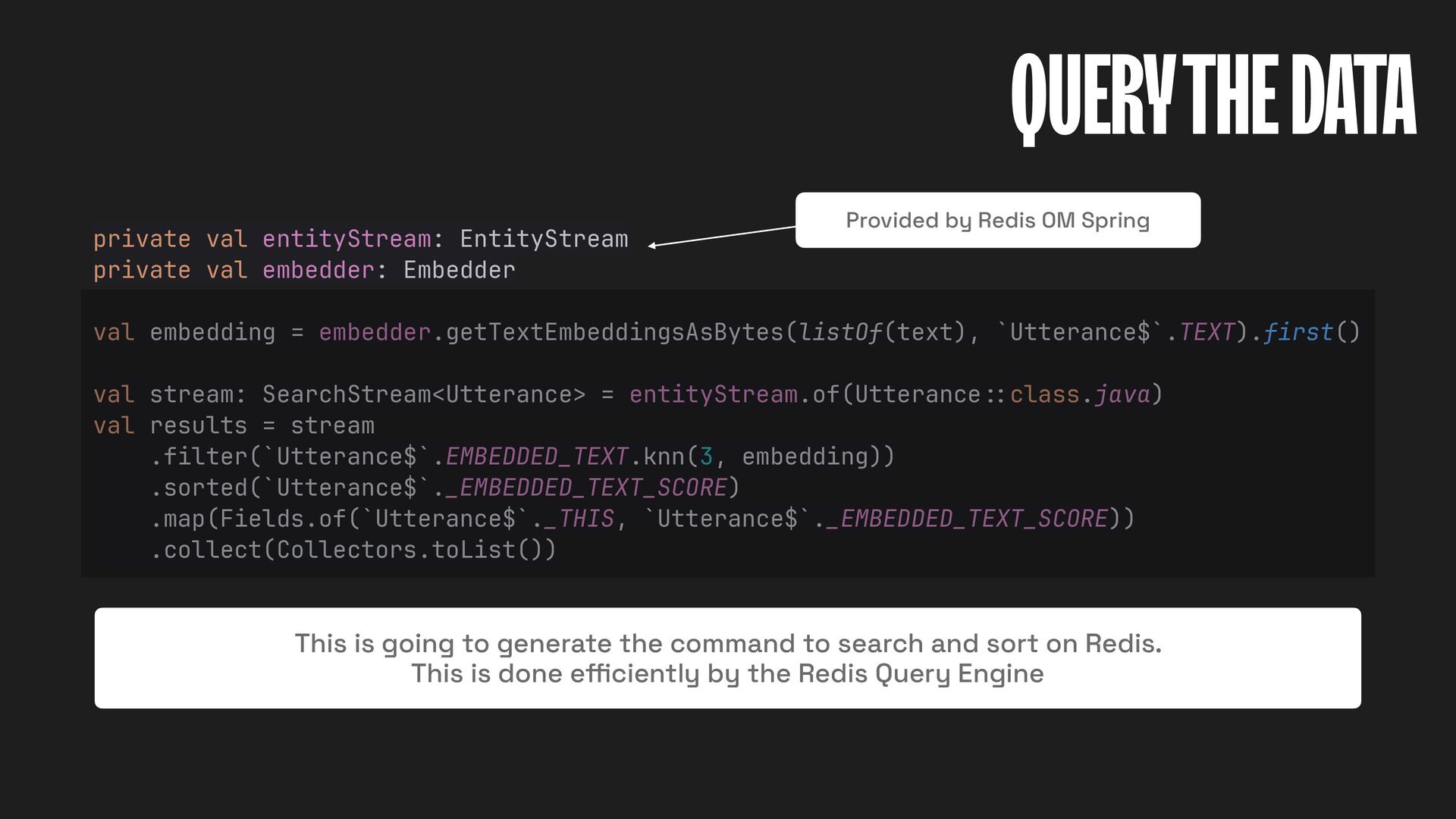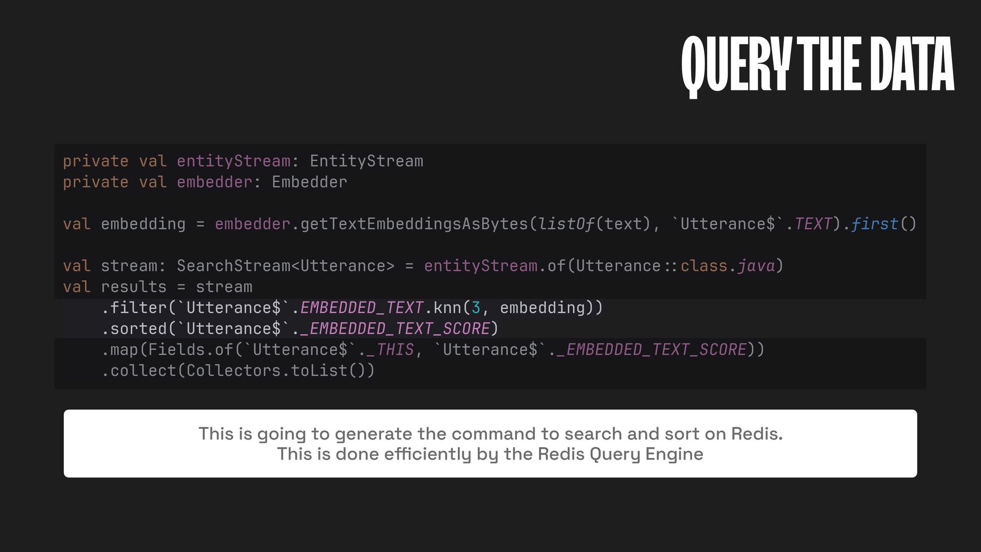 = embedder.getTextEmbeddingsAsBytes(listOf(text), `Utterance$`.TEXT).first() val stream: SearchStream<Utterance> = entityStream.of(Utterance : : class.java) val results = stream .filter(`Utterance$`.EMBEDDED_TEXT.knn(3, embedding)) .sorted(`Utterance$`._EMBEDDED_TEXT_SCORE) .map(Fields.of(`Utterance$`._THIS, `Utterance$`._EMBEDDED_TEXT_SCORE)) .collect(Collectors.toList()) QUERY THE DATA This is going to generate the command to search and sort on Redis. This is done e ff i ciently by the Redis Query Engine Provided by Redis OM Spring