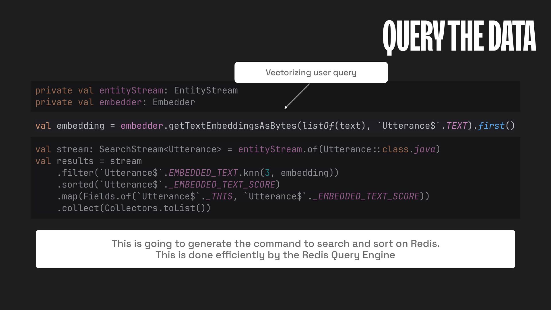 = embedder.getTextEmbeddingsAsBytes(listOf(text), `Utterance$`.TEXT).first() val stream: SearchStream<Utterance> = entityStream.of(Utterance : : class.java) val results = stream .filter(`Utterance$`.EMBEDDED_TEXT.knn(3, embedding)) .sorted(`Utterance$`._EMBEDDED_TEXT_SCORE) .map(Fields.of(`Utterance$`._THIS, `Utterance$`._EMBEDDED_TEXT_SCORE)) .collect(Collectors.toList()) QUERY THE DATA This is going to generate the command to search and sort on Redis. This is done e ff i ciently by the Redis Query Engine Vectorizing user query