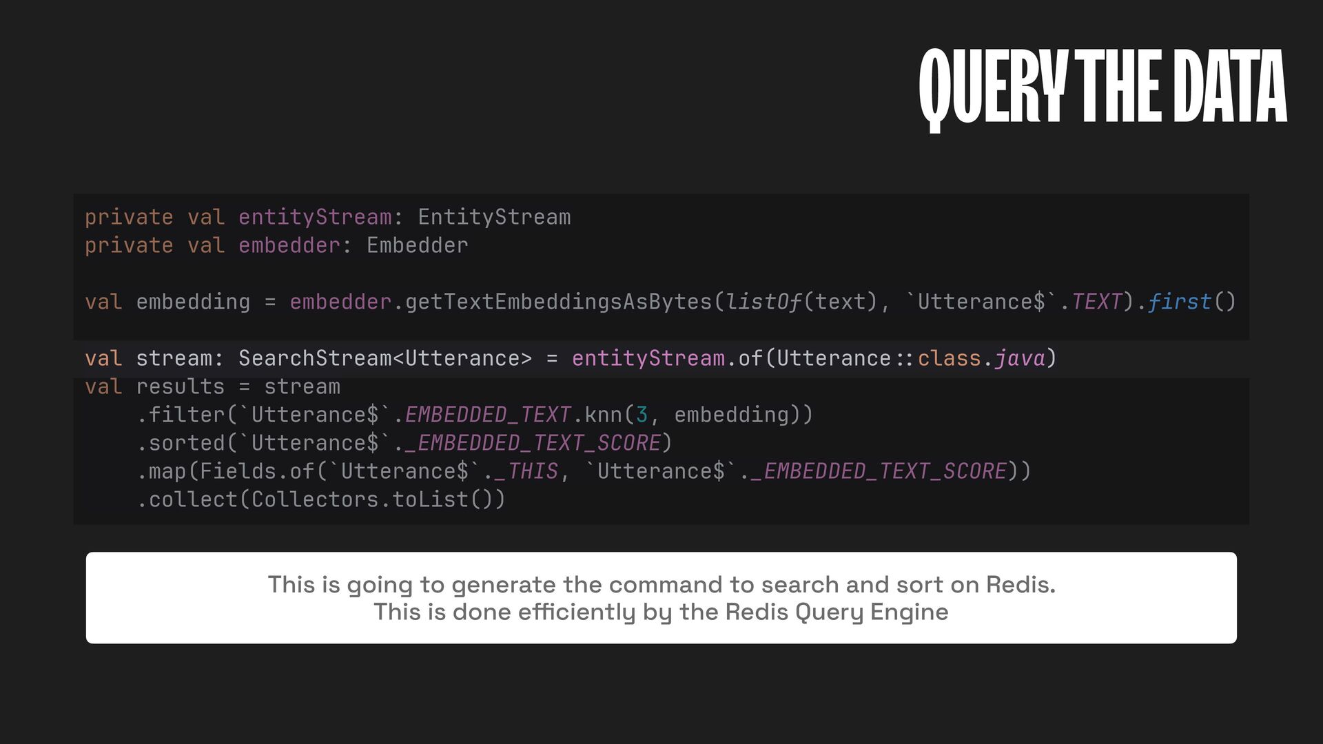 = embedder.getTextEmbeddingsAsBytes(listOf(text), `Utterance$`.TEXT).first() val stream: SearchStream<Utterance> = entityStream.of(Utterance : : class.java) val results = stream .filter(`Utterance$`.EMBEDDED_TEXT.knn(3, embedding)) .sorted(`Utterance$`._EMBEDDED_TEXT_SCORE) .map(Fields.of(`Utterance$`._THIS, `Utterance$`._EMBEDDED_TEXT_SCORE)) .collect(Collectors.toList()) QUERY THE DATA This is going to generate the command to search and sort on Redis. This is done e ff i ciently by the Redis Query Engine