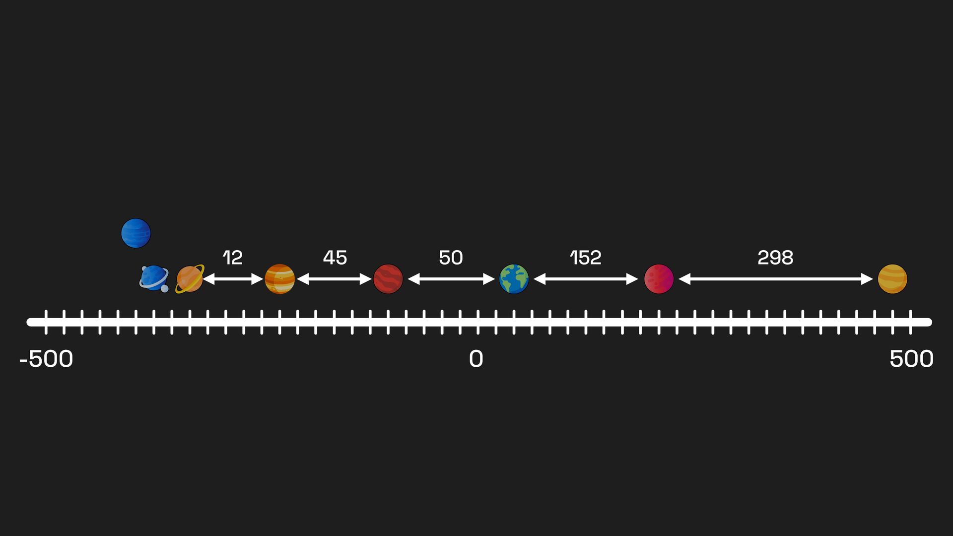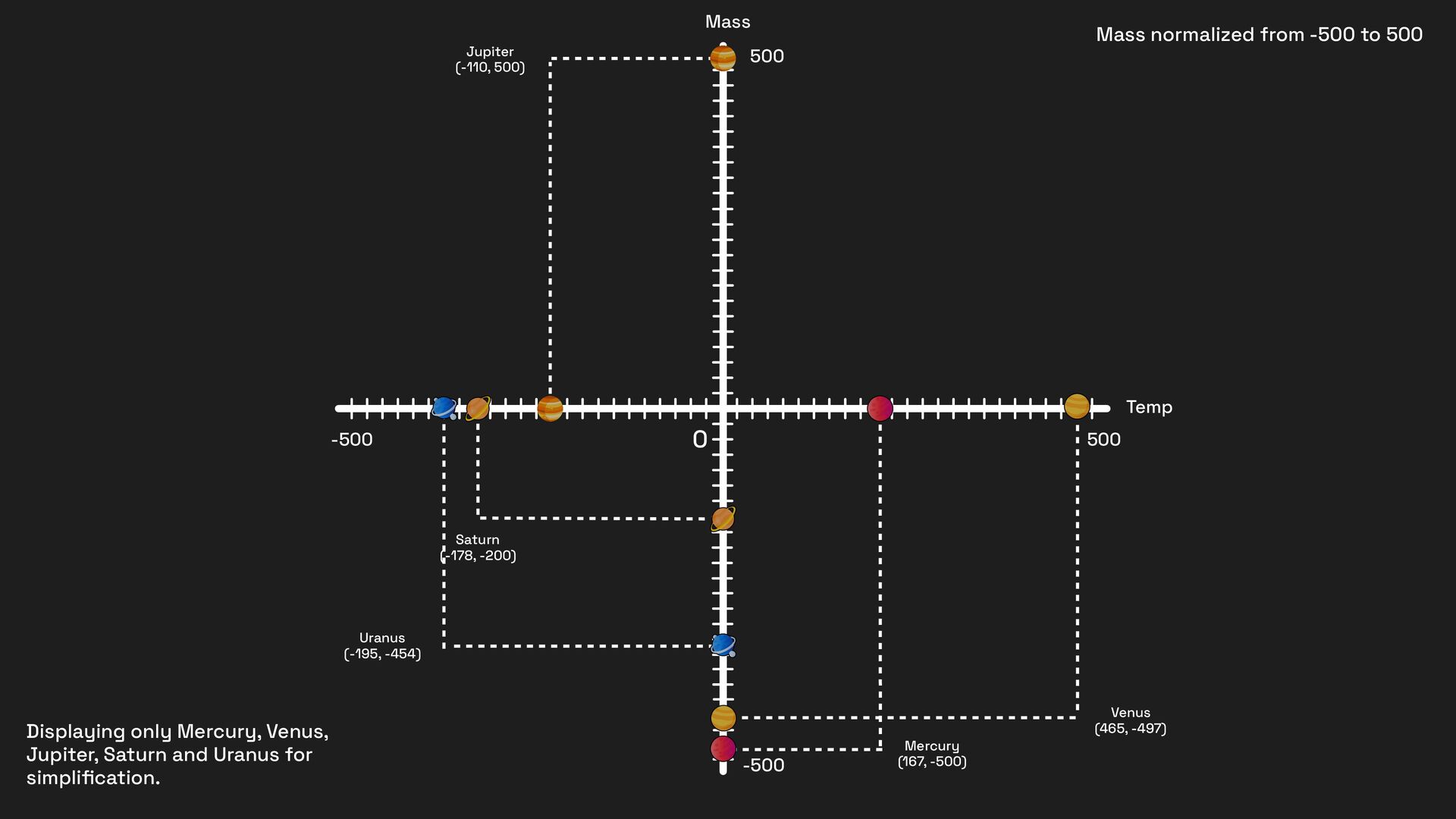 Displaying only Mercury, Venus, Jupiter, Saturn and Uranus for simpli fi cation. Mass normalized from -500 to 500 Mercury (167, -500) Venus (465, -497) Saturn (-178, -200) Uranus (-195, -454)