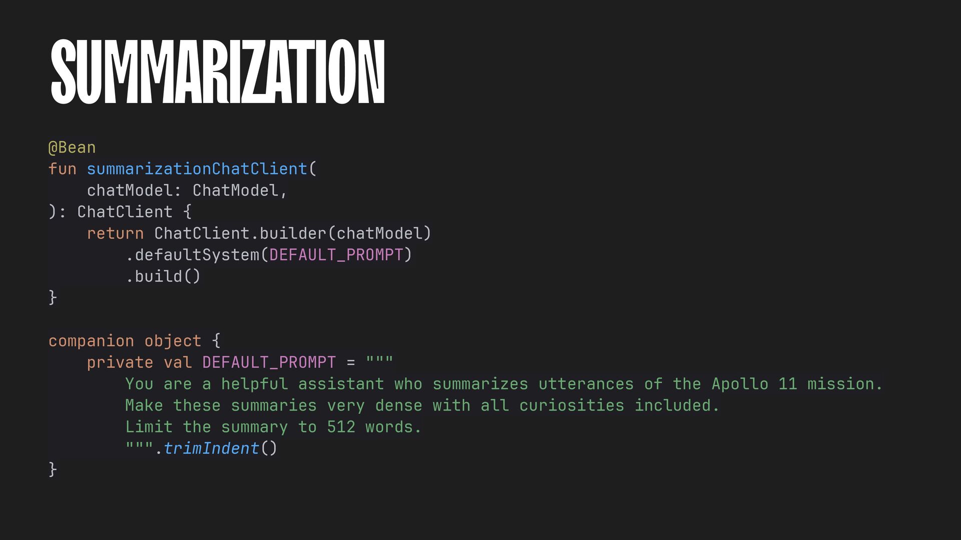 ChatClient.builder(chatModel) .defaultSystem(DEFAULT_PROMPT) .build() } companion object { private val DEFAULT_PROMPT = """ You are a helpful assistant who summarizes utterances of the Apollo 11 mission. Make these summaries very dense with all curiosities included. Limit the summary to 512 words. """.trimIndent() }