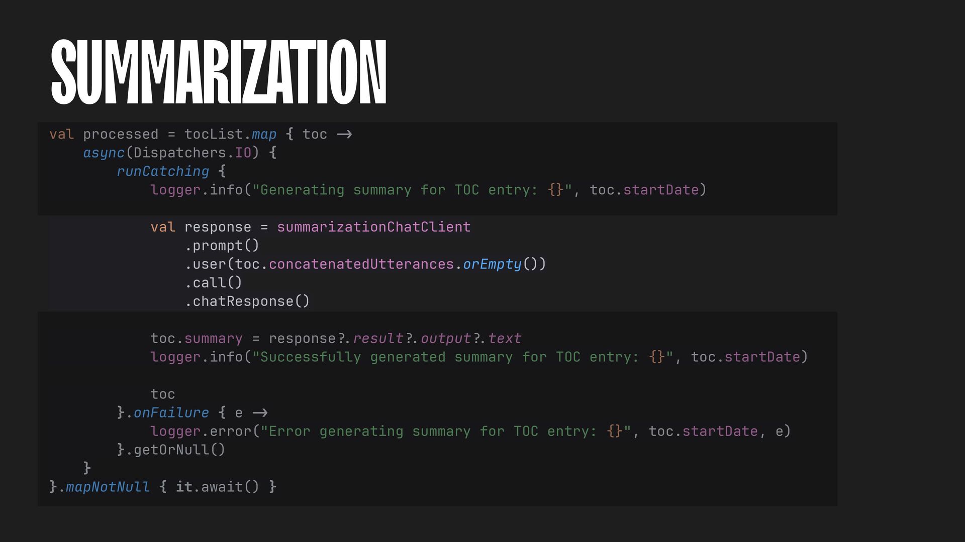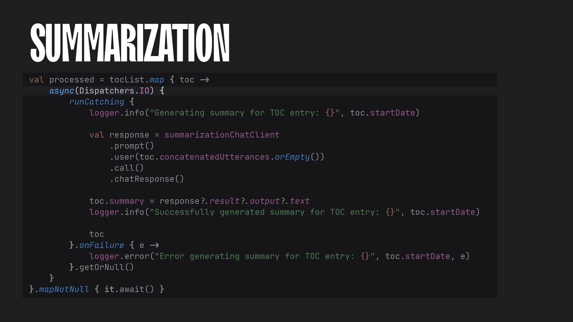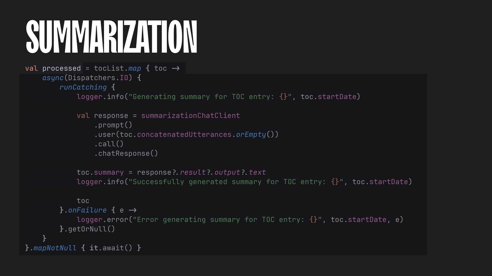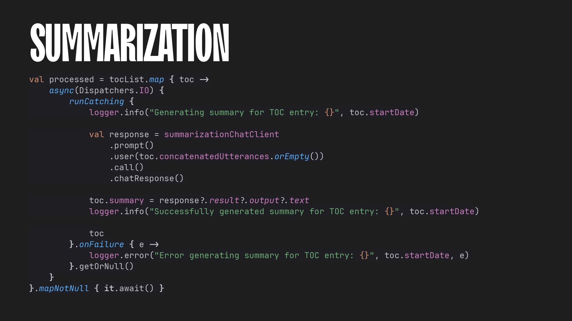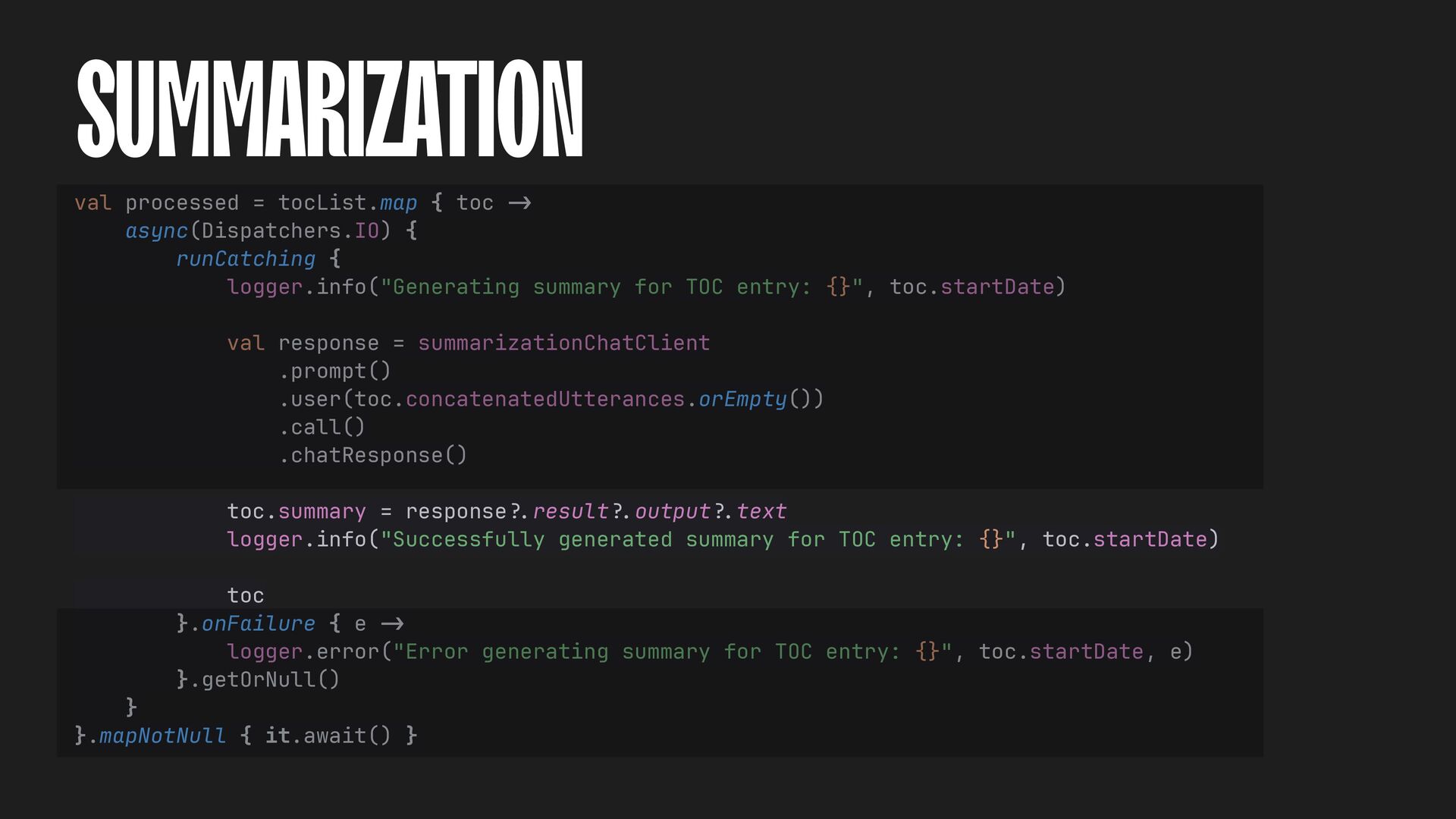 runCatching { logger.info("Generating summary for TOC entry: {}", toc.startDate) val response = summarizationChatClient .prompt() .user(toc.concatenatedUtterances.orEmpty()) .call() .chatResponse() toc.summary = response ?. result ?. output ?. text logger.info("Successfully generated summary for TOC entry: {}", toc.startDate) toc }.onFailure { e -> logger.error("Error generating summary for TOC entry: {}", toc.startDate, e) }.getOrNull() } }.mapNotNull { it.await() }