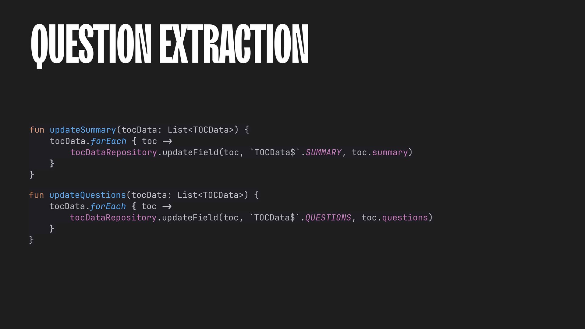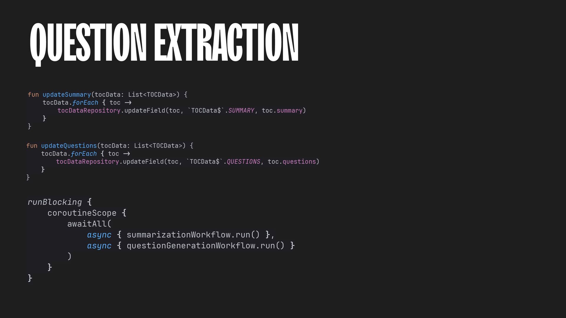 > tocDataRepository.updateField(toc, `TOCData$`.SUMMARY, toc.summary) } } fun updateQuestions(tocData: List<TOCData>) { tocData.forEach { toc - > tocDataRepository.updateField(toc, `TOCData$`.QUESTIONS, toc.questions) } } runBlocking { coroutineScope { awaitAll( async { summarizationWorkflow.run() }, async { questionGenerationWorkflow.run() } ) } }
