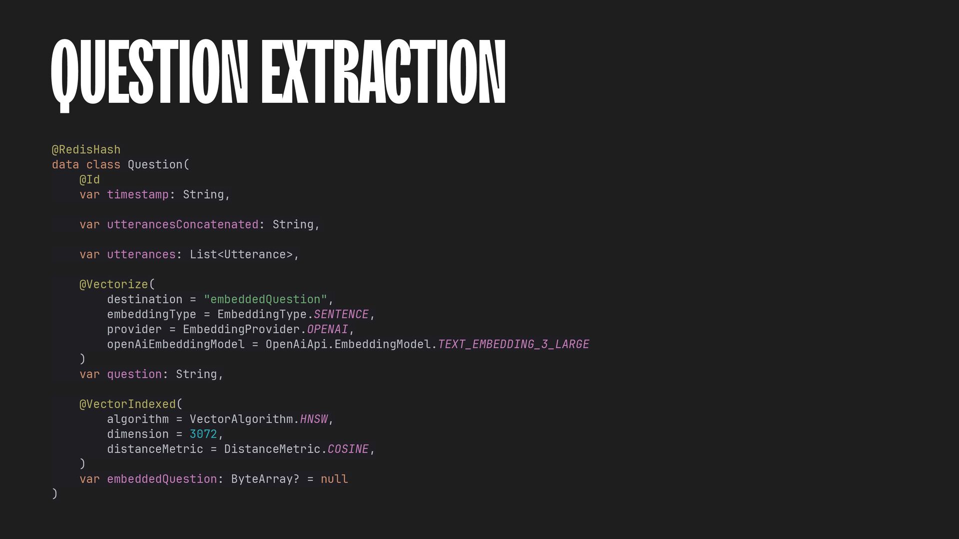 var utterancesConcatenated: String, var utterances: List<Utterance>, @Vectorize( destination = "embeddedQuestion", embeddingType = EmbeddingType.SENTENCE, provider = EmbeddingProvider.OPENAI, openAiEmbeddingModel = OpenAiApi.EmbeddingModel.TEXT_EMBEDDING_3_LARGE ) var question: String, @VectorIndexed( algorithm = VectorAlgorithm.HNSW, dimension = 3072, distanceMetric = DistanceMetric.COSINE, ) var embeddedQuestion: ByteArray? = null )