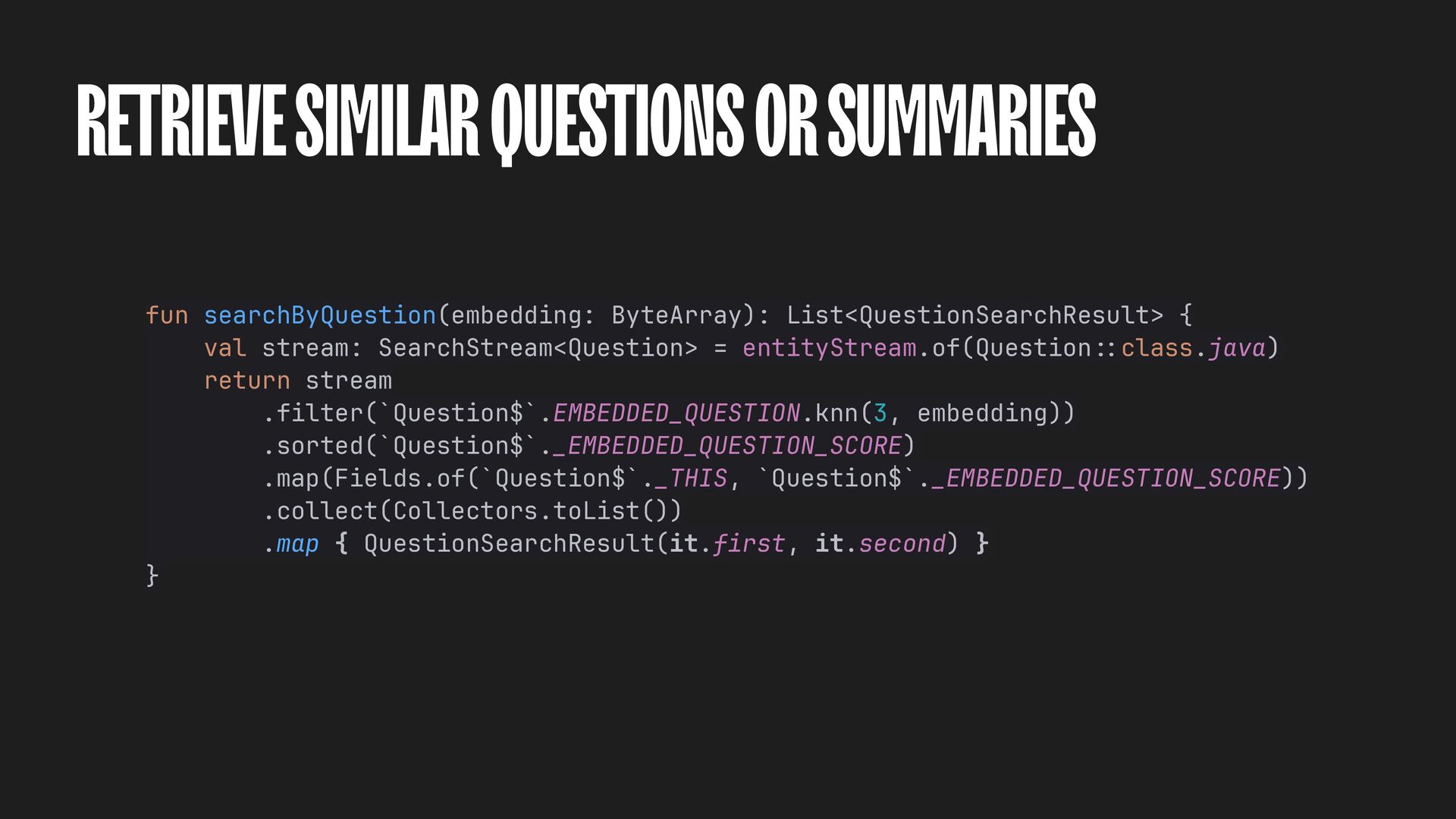 :: class.java) return stream .filter(`Question$`.EMBEDDED_QUESTION.knn(3, embedding)) .sorted(`Question$`._EMBEDDED_QUESTION_SCORE) .map(Fields.of(`Question$`._THIS, `Question$`._EMBEDDED_QUESTION_SCORE)) .collect(Collectors.toList()) .map { QuestionSearchResult(it.first, it.second) } } RETRIEVE SIMILAR QUESTIONS OR SUMMARIES