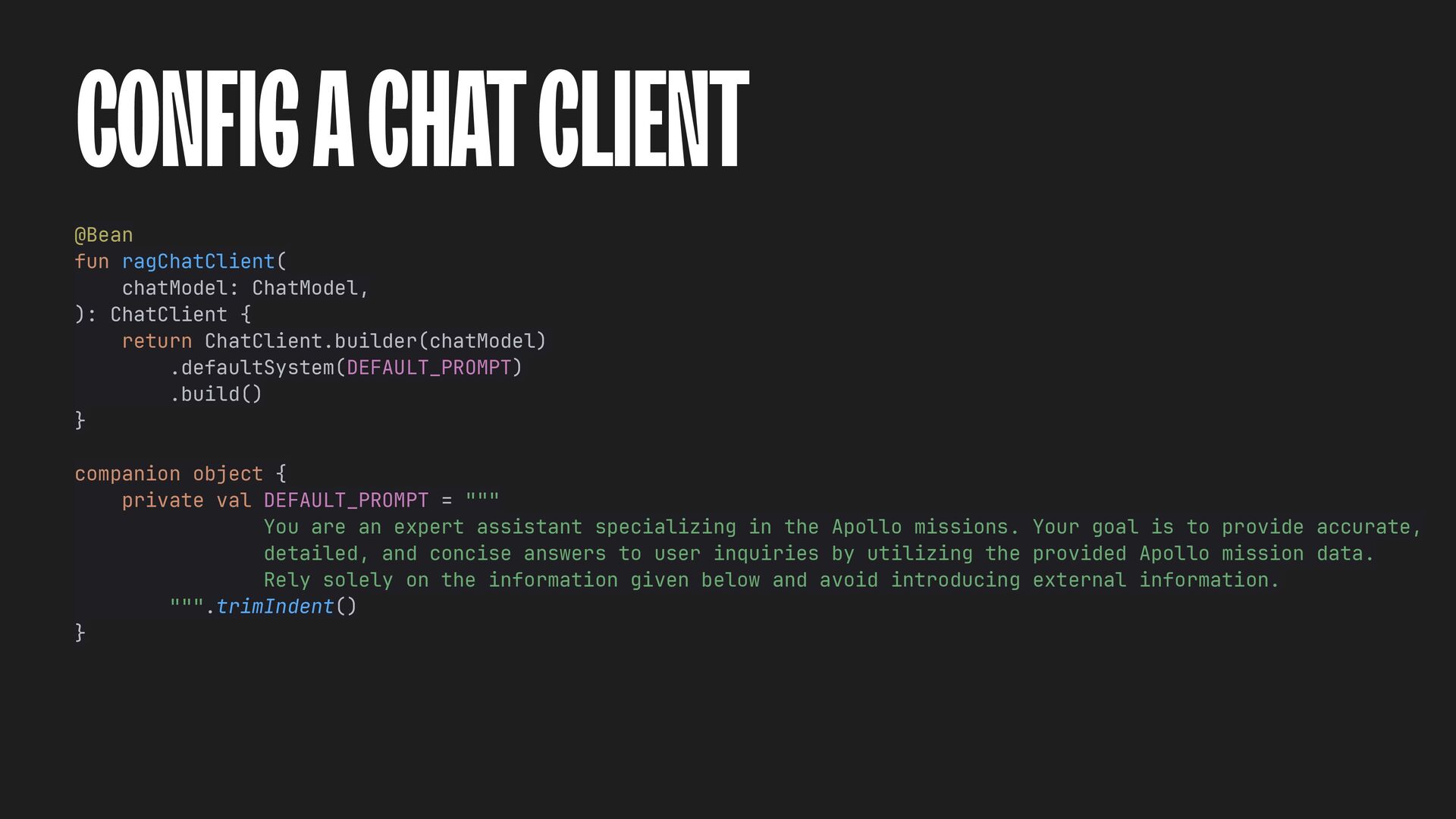 .defaultSystem(DEFAULT_PROMPT) .build() } companion object { private val DEFAULT_PROMPT = """ You are an expert assistant specializing in the Apollo missions. Your goal is to provide accurate, detailed, and concise answers to user inquiries by utilizing the provided Apollo mission data. Rely solely on the information given below and avoid introducing external information. """.trimIndent() } CONFIG A CHAT CLIENT