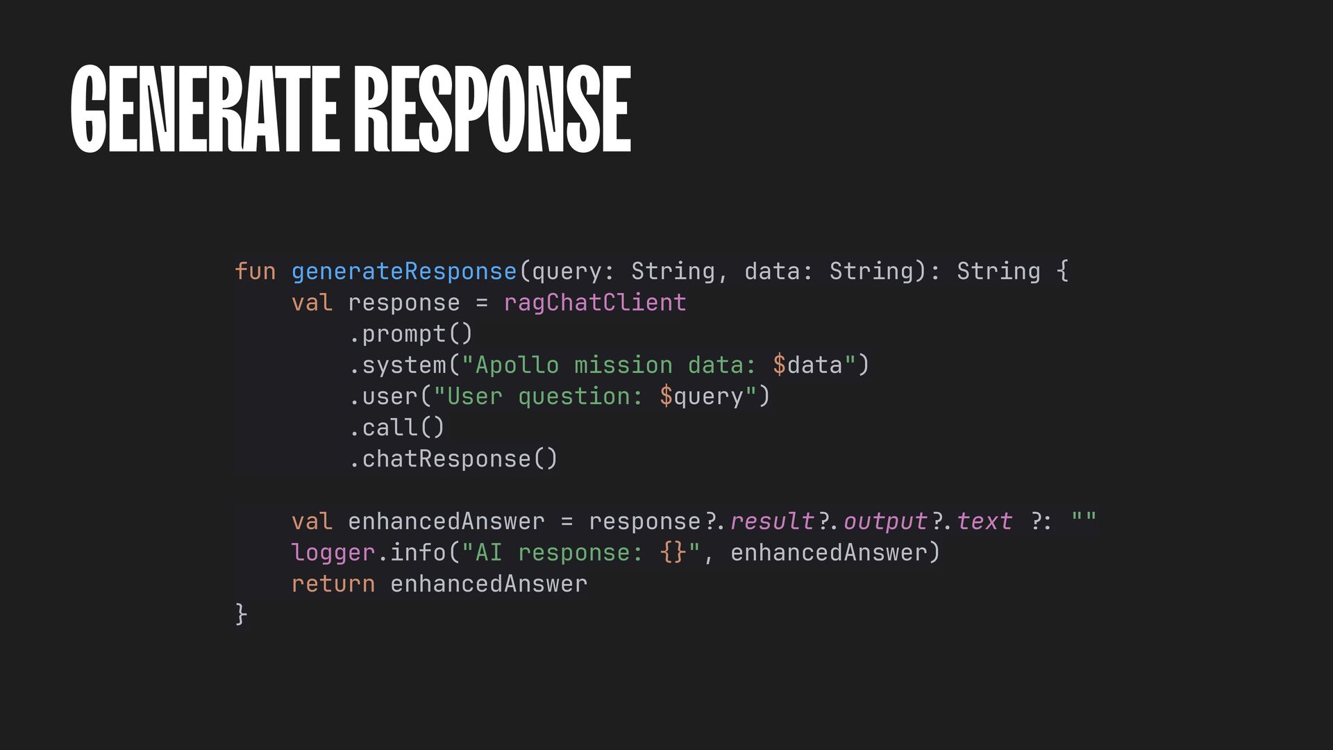 ragChatClient .prompt() .system("Apollo mission data: $data") .user("User question: $query") .call() .chatResponse() val enhancedAnswer = response ?. result ?. output ?. text ? : "" logger.info("AI response: {}", enhancedAnswer) return enhancedAnswer } GENERATE RESPONSE