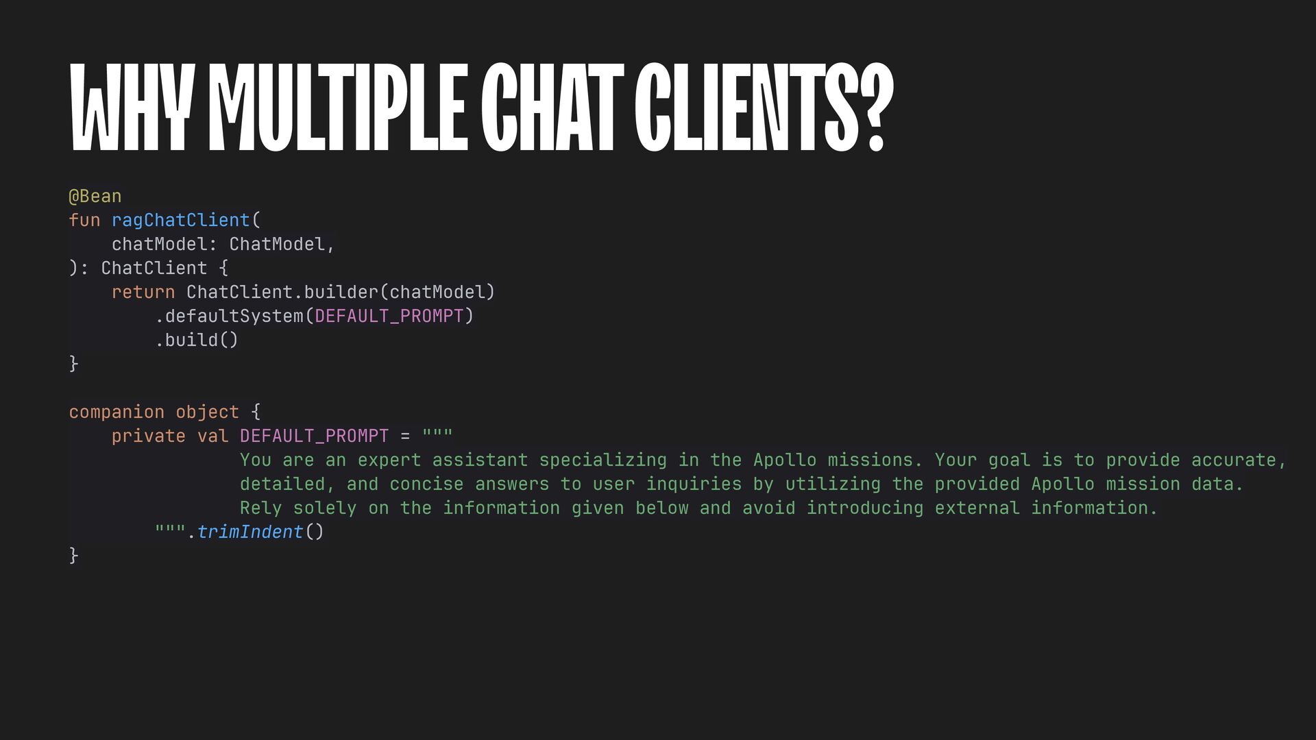 .defaultSystem(DEFAULT_PROMPT) .build() } companion object { private val DEFAULT_PROMPT = """ You are an expert assistant specializing in the Apollo missions. Your goal is to provide accurate, detailed, and concise answers to user inquiries by utilizing the provided Apollo mission data. Rely solely on the information given below and avoid introducing external information. """.trimIndent() } WHY MULTIPLE CHAT CLIENTS?