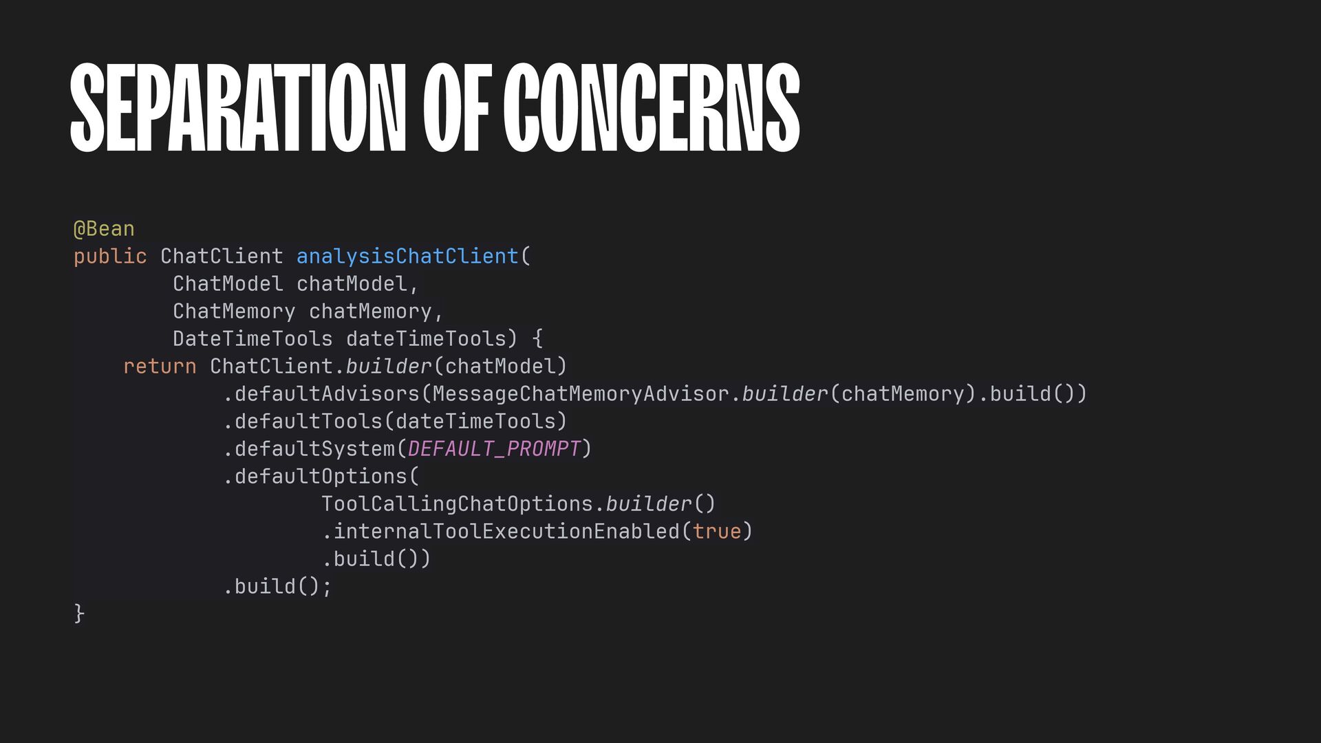 { return ChatClient.builder(chatModel) .defaultAdvisors(MessageChatMemoryAdvisor.builder(chatMemory).build()) .defaultTools(dateTimeTools) .defaultSystem(DEFAULT_PROMPT) .defaultOptions( ToolCallingChatOptions.builder() .internalToolExecutionEnabled(true) .build()) .build(); } SEPARATION OF CONCERNS
