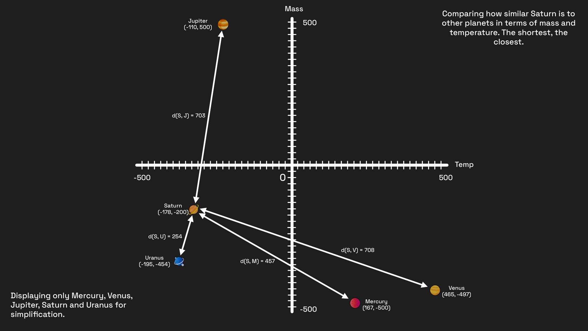 Displaying only Mercury, Venus, Jupiter, Saturn and Uranus for simpli fi cation. Comparing how similar Saturn is to other planets in terms of mass and temperature. The shortest, the closest. Mercury (167, -500) Venus (465, -497) Saturn (-178, -200) Uranus (-195, -454) d(S, U) = 254 d(S, J) = 703 d(S, M) = 457 d(S, V) = 708