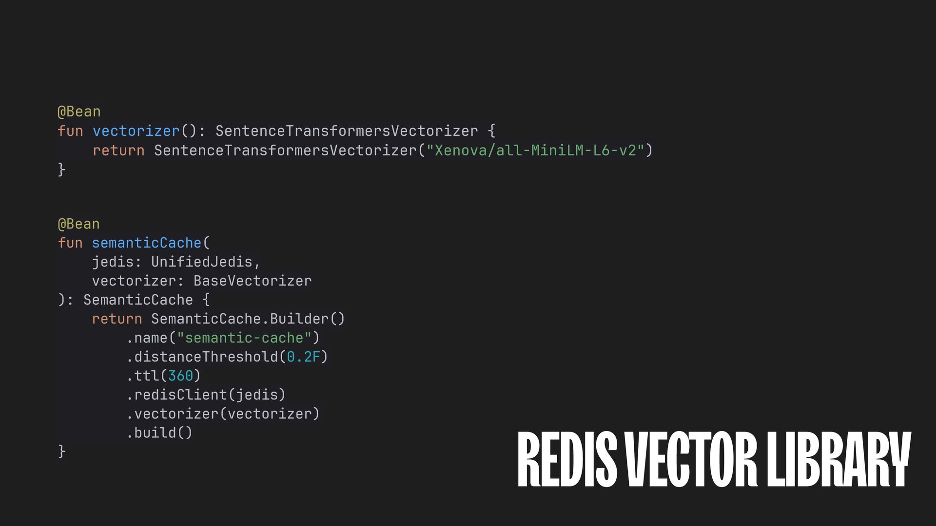 semanticCache( jedis: UnifiedJedis, vectorizer: BaseVectorizer ): SemanticCache { return SemanticCache.Builder() .name("semantic-cache") .distanceThreshold(0.2F) .ttl(360) .redisClient(jedis) .vectorizer(vectorizer) .build() } REDIS VECTOR LIBRARY
