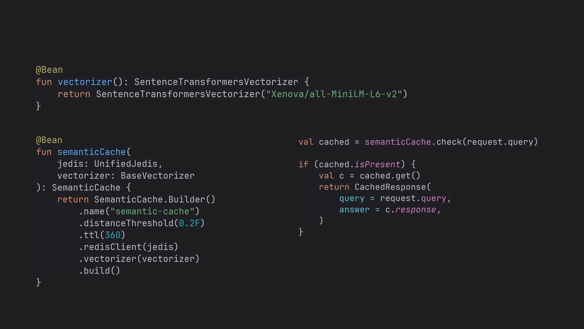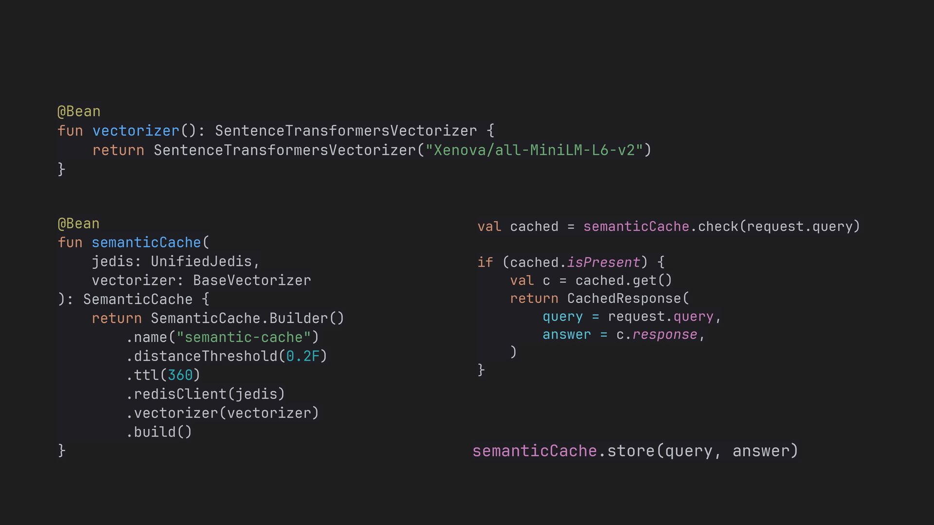 semanticCache( jedis: UnifiedJedis, vectorizer: BaseVectorizer ): SemanticCache { return SemanticCache.Builder() .name("semantic-cache") .distanceThreshold(0.2F) .ttl(360) .redisClient(jedis) .vectorizer(vectorizer) .build() } semanticCache.store(query, answer) val cached = semanticCache.check(request.query) if (cached.isPresent) { val c = cached.get() return CachedResponse( query = request.query, answer = c.response, ) }