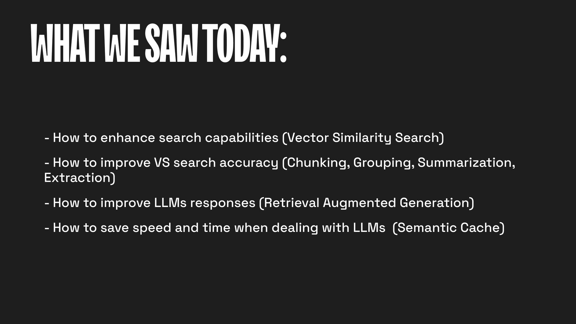 How to improve VS search accuracy (Chunking, Grouping, Summarization, Extraction) - How to improve LLMs responses (Retrieval Augmented Generation) - How to save speed and time when dealing with LLMs (Semantic Cache) WHAT WE SAW TODAY: