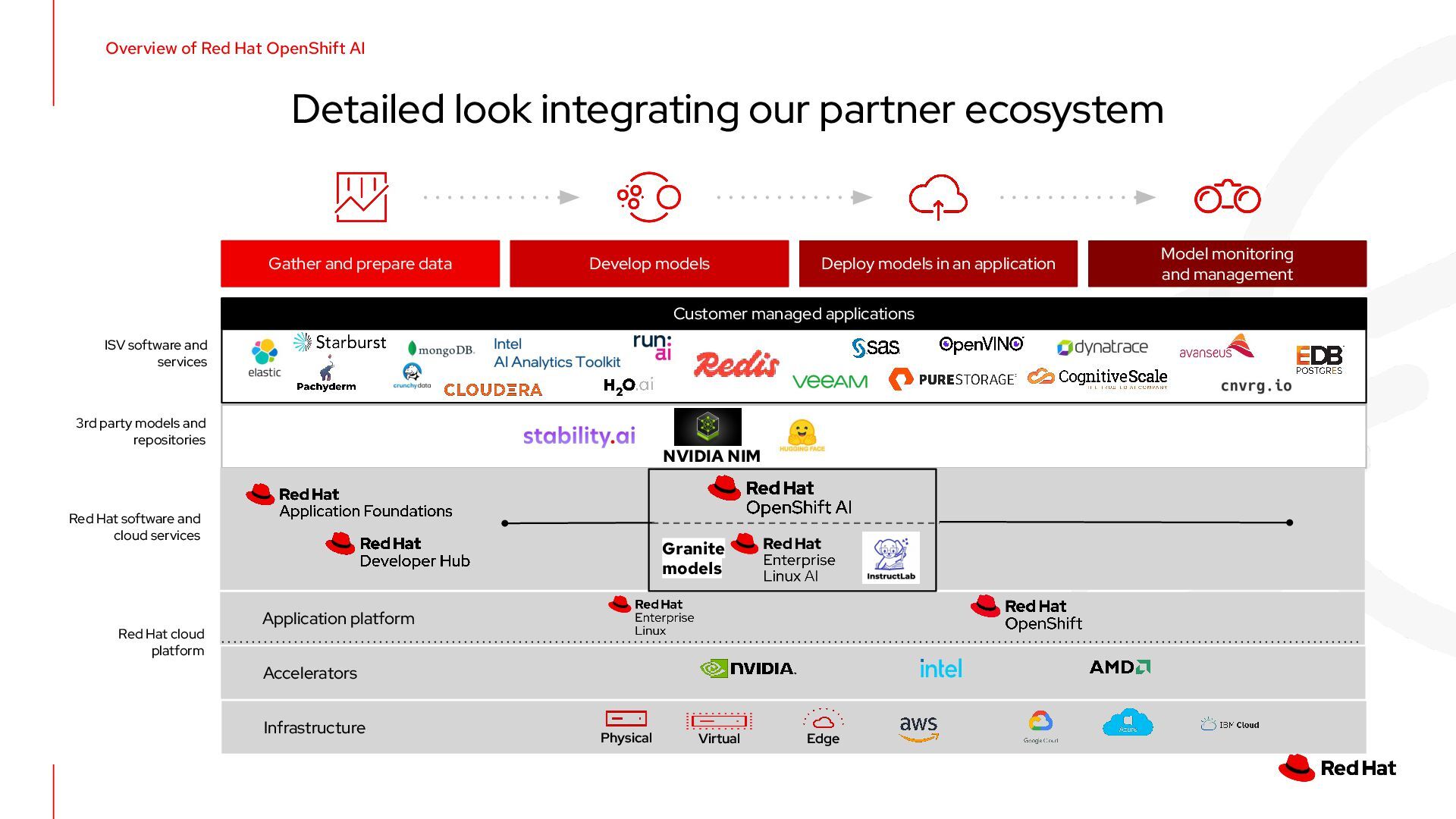 monitoring and management Develop models Detailed look integrating our partner ecosystem Application platform Accelerators Infrastructure ISV software and services Customer managed applications 3rd party models and repositories Red Hat software and cloud services Red Hat cloud platform Overview of Red Hat OpenShift AI NVIDIA NIM Granite models Physical Virtual Edge