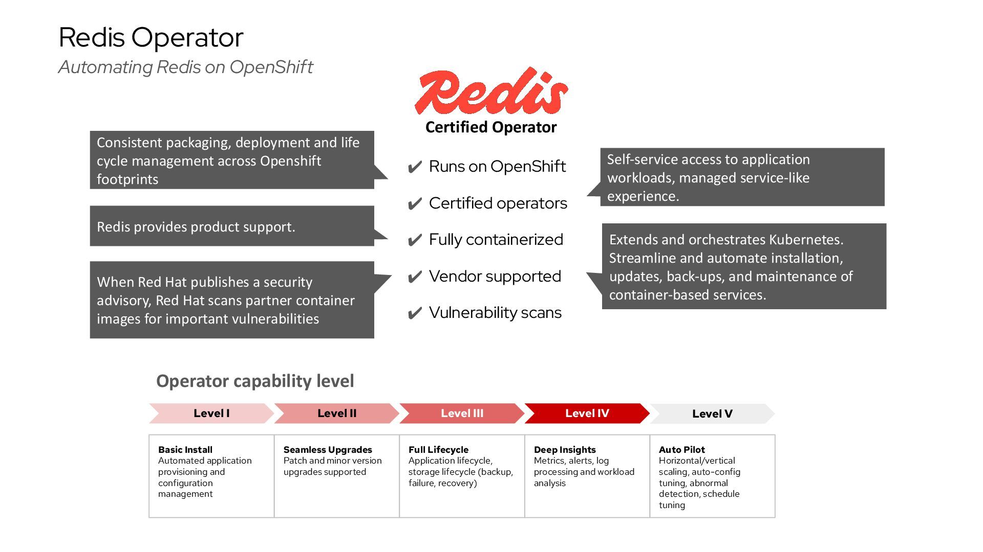 Seamless Upgrades Patch and minor version upgrades supported Basic Install Automated application provisioning and configuration management Redis Operator Automating Redis on OpenShift ✔ Runs on OpenShift ✔ Certified operators ✔ Fully containerized ✔ Vendor supported ✔ Vulnerability scans Operator capability level Self-service access to application workloads, managed service-like experience. Consistent packaging, deployment and life cycle management across Openshift footprints Extends and orchestrates Kubernetes. Streamline and automate installation, updates, back-ups, and maintenance of container-based services. Redis provides product support. When Red Hat publishes a security advisory, Red Hat scans partner container images for important vulnerabilities Certified Operator Level I Level II Level III Level IV Level V Deep Insights Metrics, alerts, log processing and workload analysis Full Lifecycle Application lifecycle, storage lifecycle (backup, failure, recovery)