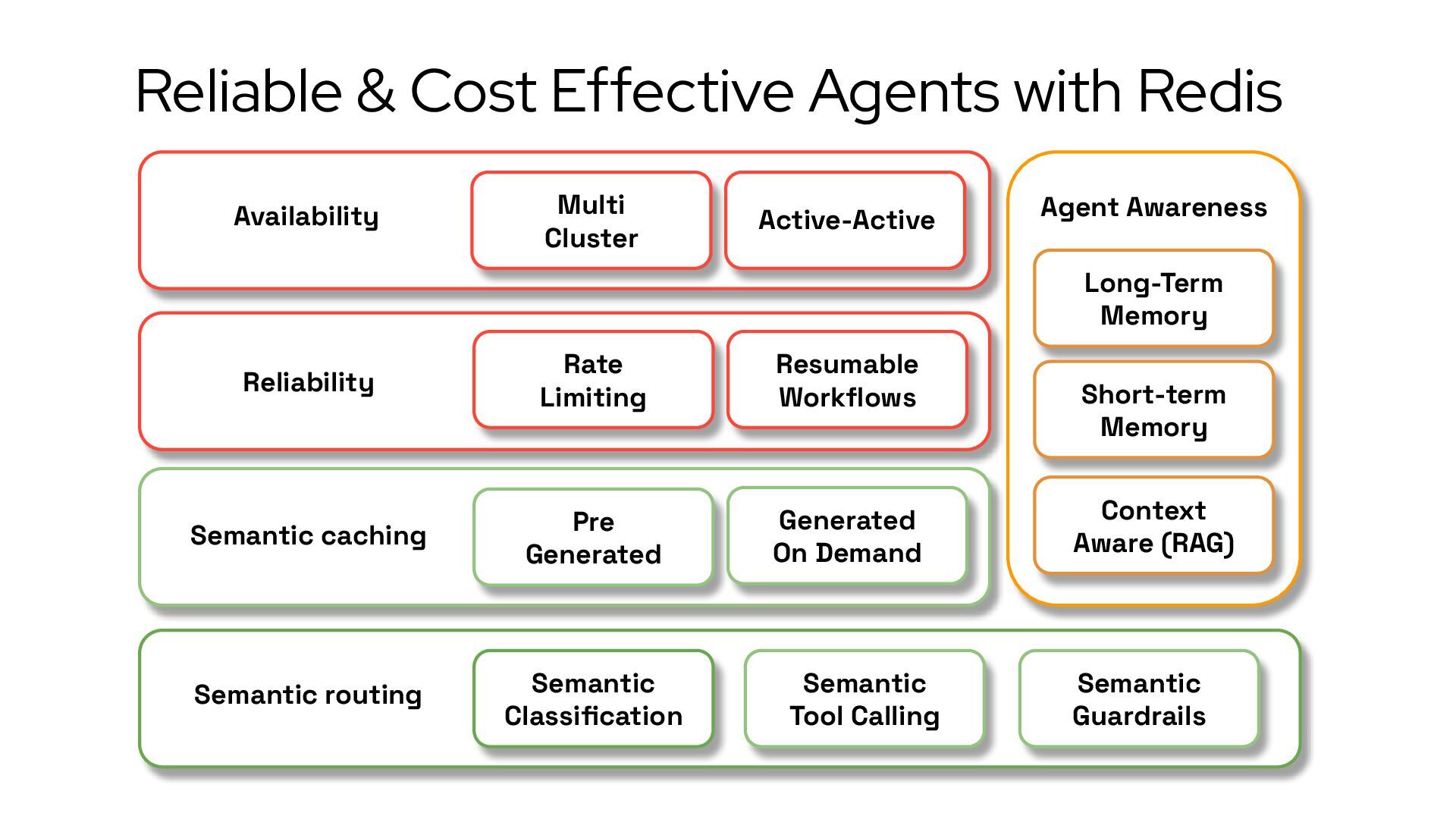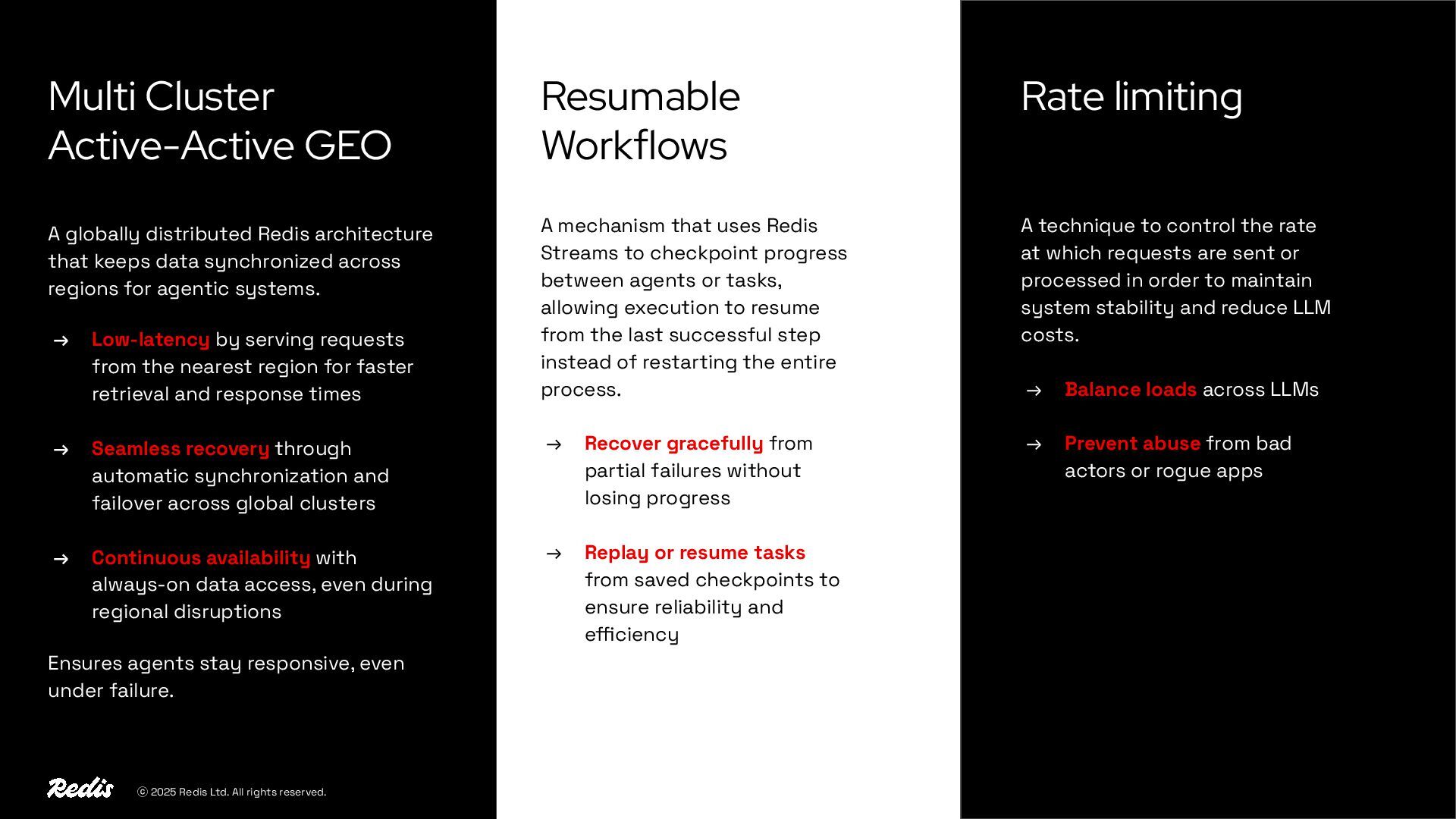 Active-Active GEO A globally distributed Redis architecture that keeps data synchronized across regions for agentic systems. → Low-latency by serving requests from the nearest region for faster retrieval and response times → Seamless recovery through automatic synchronization and failover across global clusters → Continuous availability with always-on data access, even during regional disruptions Ensures agents stay responsive, even under failure. Rate limiting A technique to control the rate at which requests are sent or processed in order to maintain system stability and reduce LLM costs. → Balance loads across LLMs → Prevent abuse from bad actors or rogue apps Resumable Workflows A mechanism that uses Redis Streams to checkpoint progress between agents or tasks, allowing execution to resume from the last successful step instead of restarting the entire process. → Recover gracefully from partial failures without losing progress → Replay or resume tasks from saved checkpoints to ensure reliability and efficiency