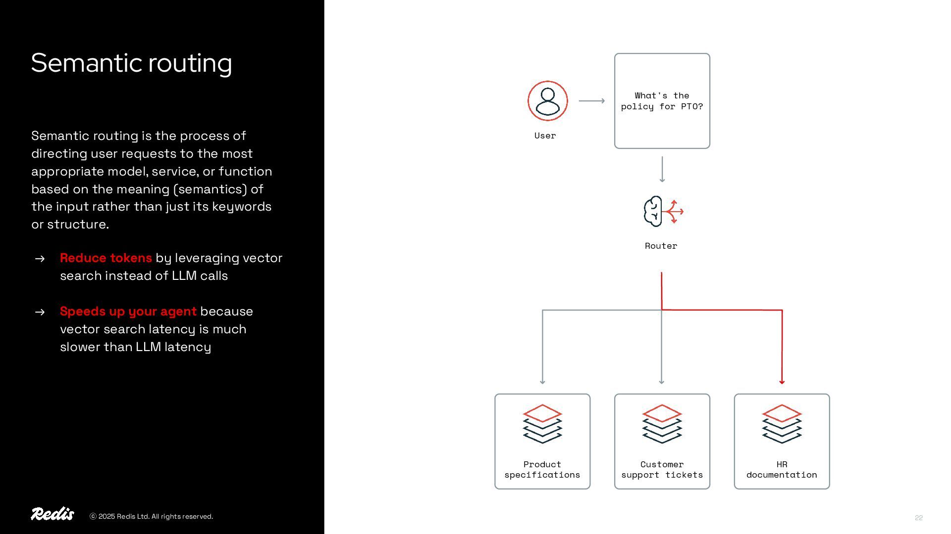 Semantic routing is the process of directing user requests to the most appropriate model, service, or function based on the meaning (semantics) of the input rather than just its keywords or structure. → Reduce tokens by leveraging vector search instead of LLM calls → Speeds up your agent because vector search latency is much slower than LLM latency HR documentation Customer support tickets Product specifications User Router What's the policy for PTO?