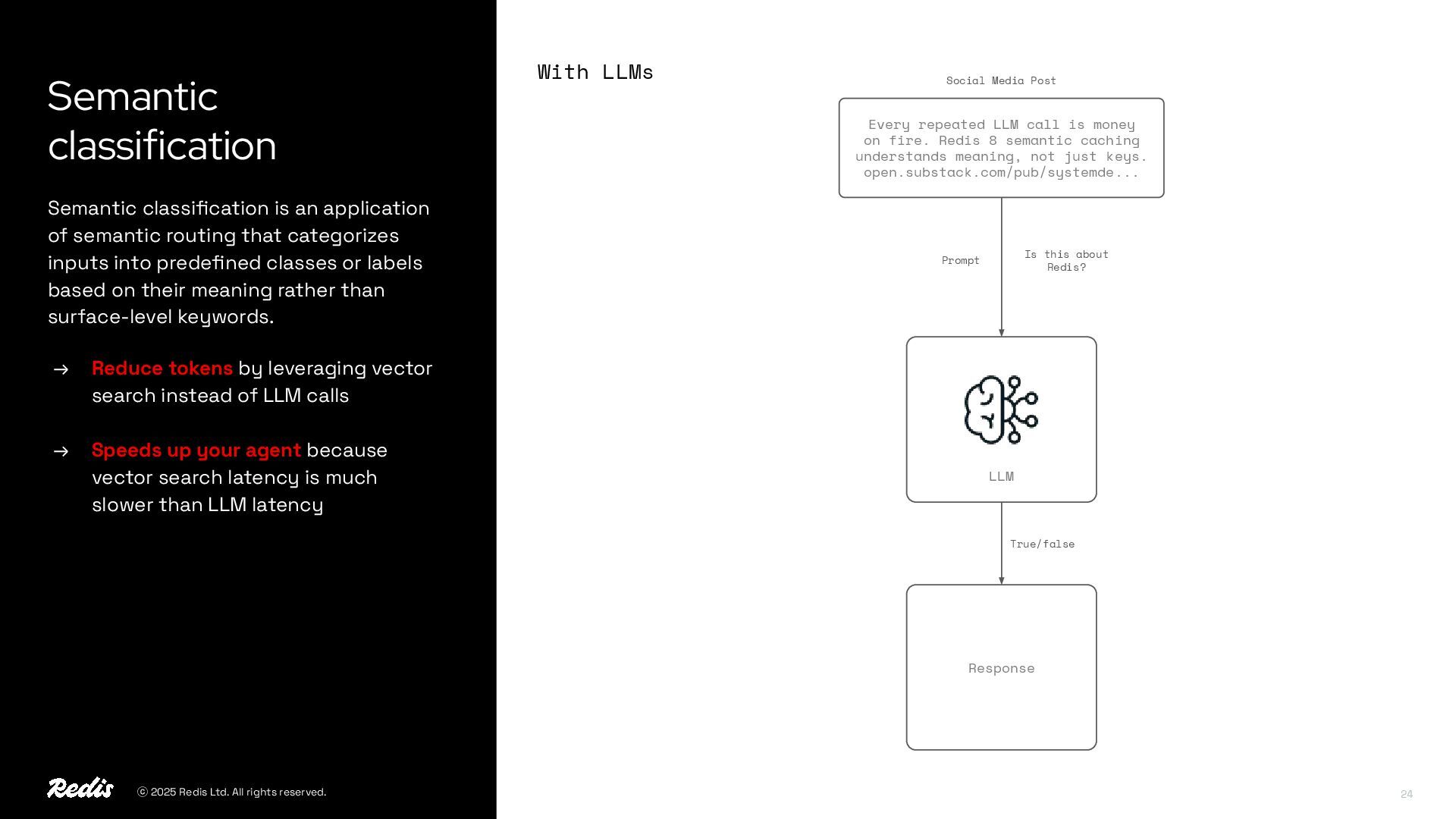 Semantic classification is an application of semantic routing that categorizes inputs into predefined classes or labels based on their meaning rather than surface-level keywords. → Reduce tokens by leveraging vector search instead of LLM calls → Speeds up your agent because vector search latency is much slower than LLM latency Is this about Redis? LLM True/false Response Every repeated LLM call is money on fire. Redis 8 semantic caching understands meaning, not just keys. open.substack.com/pub/systemde... Social Media Post Prompt With LLMs