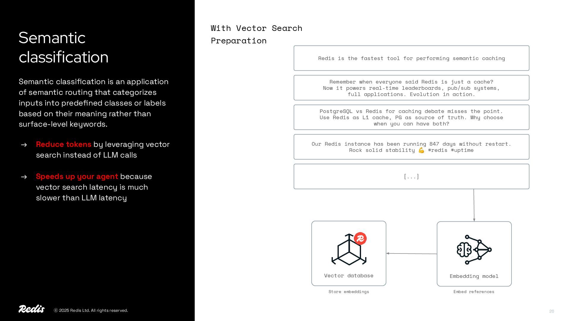 Semantic classification Semantic classification is an application of semantic routing that categorizes inputs into predefined classes or labels based on their meaning rather than surface-level keywords. → Reduce tokens by leveraging vector search instead of LLM calls → Speeds up your agent because vector search latency is much slower than LLM latency With Vector Search Preparation Redis is the fastest tool for performing semantic caching Remember when everyone said Redis is just a cache? Now it powers real-time leaderboards, pub/sub systems, full applications. Evolution in action. PostgreSQL vs Redis for caching debate misses the point. Use Redis as L1 cache, PG as source of truth. Why choose when you can have both? Our Redis instance has been running 847 days without restart. Rock solid stability 💪 #redis #uptime [...] Embedding model Embed references Store embeddings