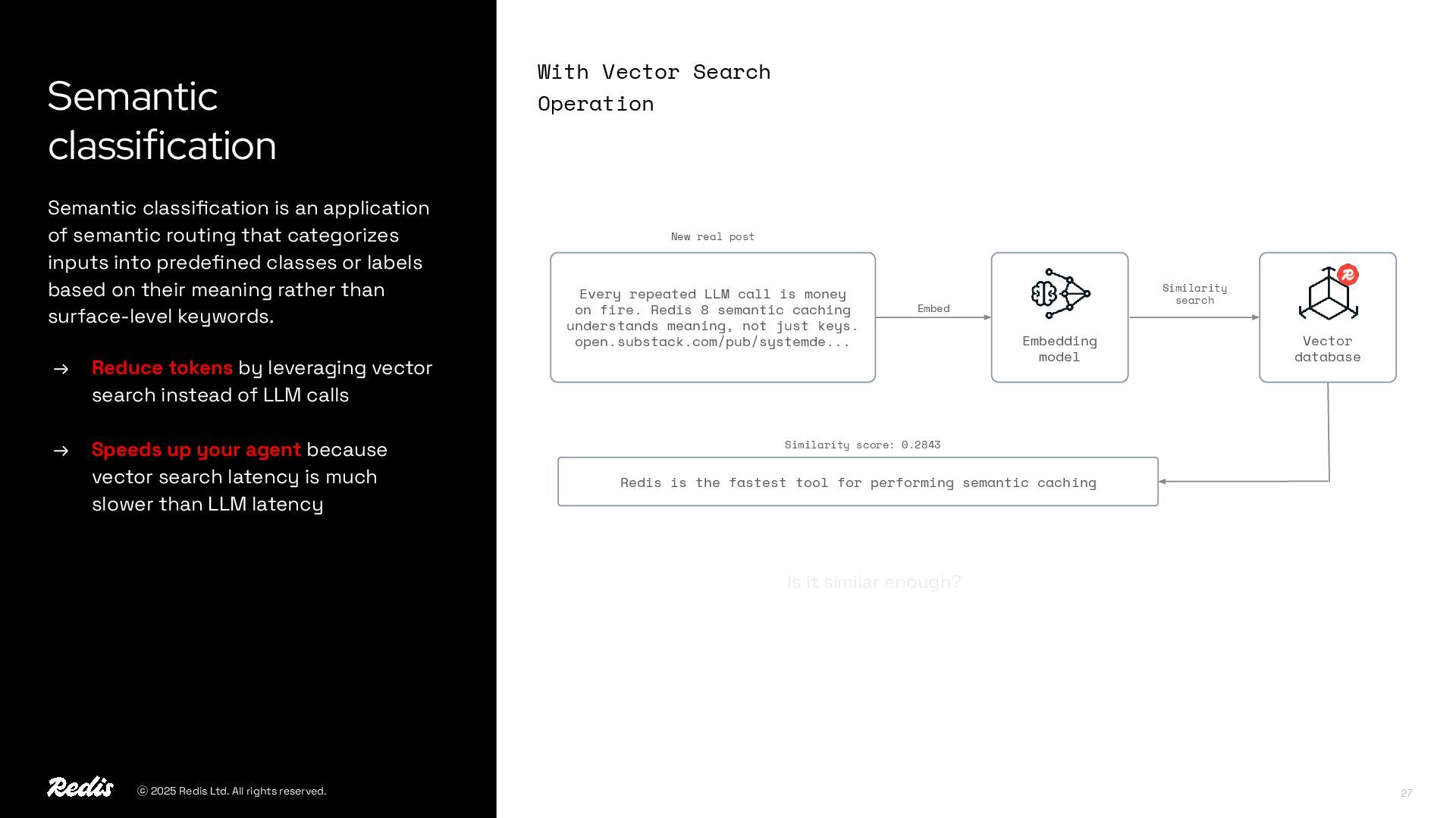 Semantic classification is an application of semantic routing that categorizes inputs into predefined classes or labels based on their meaning rather than surface-level keywords. → Reduce tokens by leveraging vector search instead of LLM calls → Speeds up your agent because vector search latency is much slower than LLM latency With Vector Search Operation New real post Embed Embedding model Vector database Similarity search Redis is the fastest tool for performing semantic caching Similarity score: 0.2843 Is it similar enough? Every repeated LLM call is money on fire. Redis 8 semantic caching understands meaning, not just keys. open.substack.com/pub/systemde...
