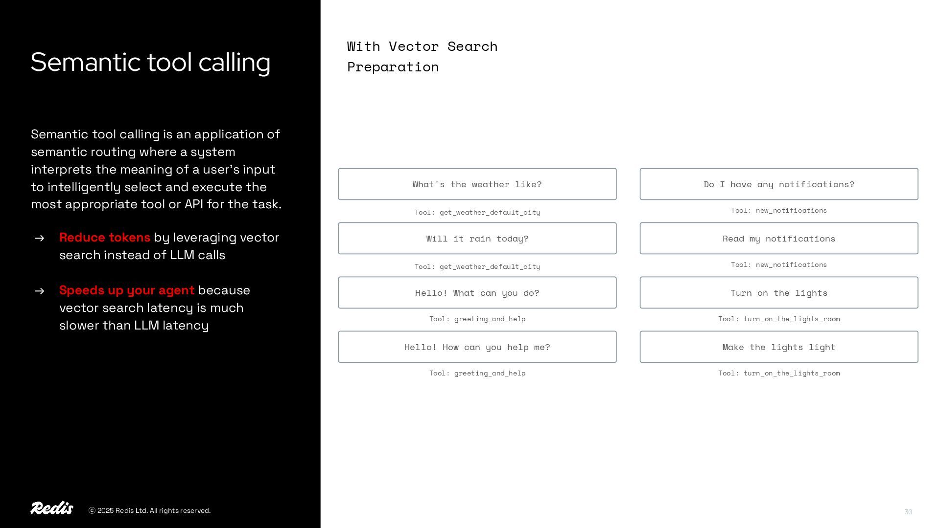 calling Semantic tool calling is an application of semantic routing where a system interprets the meaning of a user’s input to intelligently select and execute the most appropriate tool or API for the task. → Reduce tokens by leveraging vector search instead of LLM calls → Speeds up your agent because vector search latency is much slower than LLM latency With Vector Search Preparation What's the weather like? Tool: get_weather_default_city Will it rain today? Hello! What can you do? Tool: greeting_and_help Hello! How can you help me? Tool: greeting_and_help Do I have any notifications? Tool: new_notifications Read my notifications Tool: new_notifications Turn on the lights Tool: turn_on_the_lights_room Make the lights light Tool: turn_on_the_lights_room Tool: get_weather_default_city
