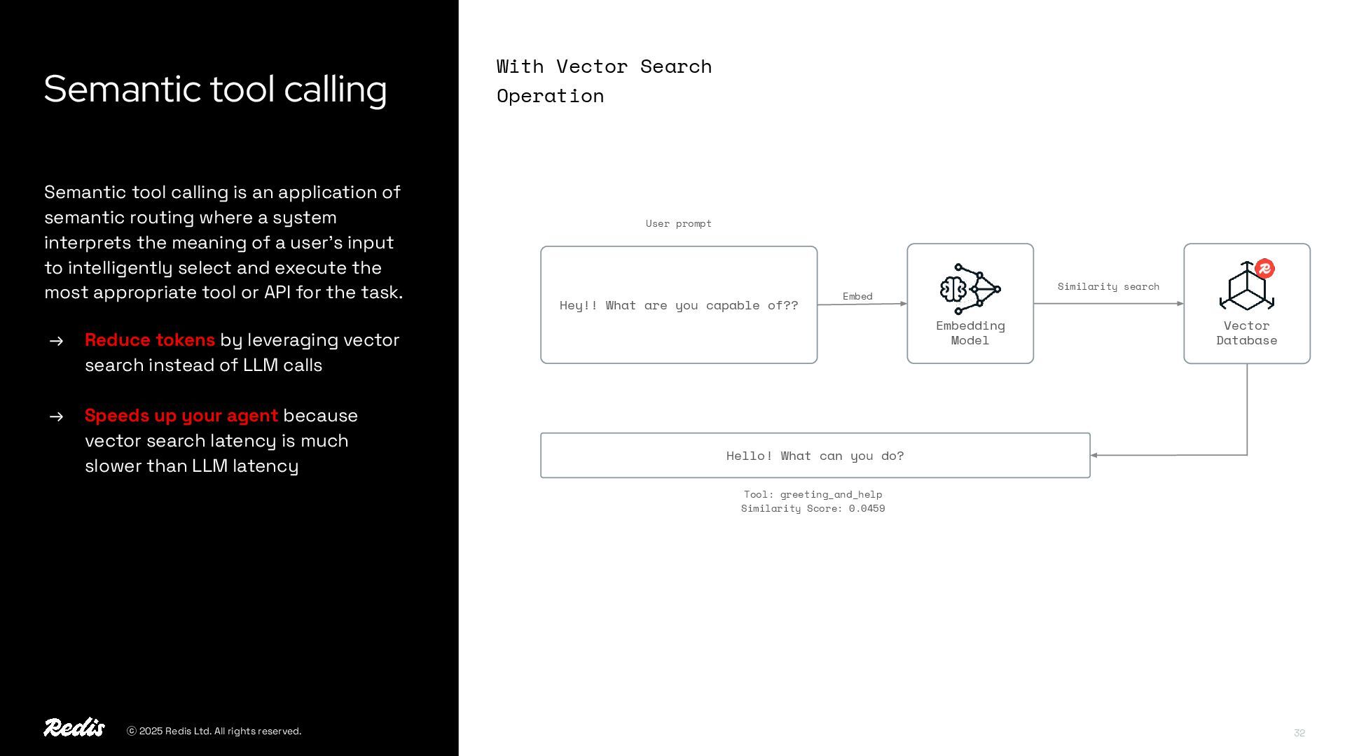 calling Semantic tool calling is an application of semantic routing where a system interprets the meaning of a user’s input to intelligently select and execute the most appropriate tool or API for the task. → Reduce tokens by leveraging vector search instead of LLM calls → Speeds up your agent because vector search latency is much slower than LLM latency With Vector Search Operation Hey!! What are you capable of?? User prompt Hello! What can you do? Similarity Score: 0.0459 Tool: greeting_and_help Embedding Model Embed Vector Database Similarity search