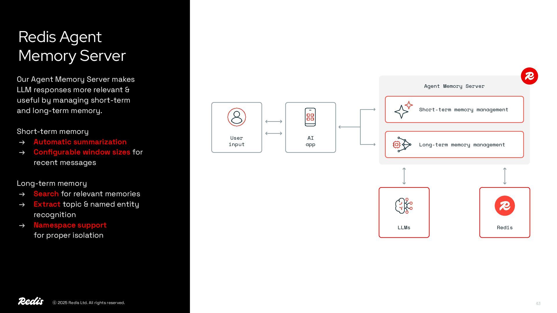 Agent Memory Server Our Agent Memory Server makes LLM responses more relevant & useful by managing short-term and long-term memory. Short-term memory → Automatic summarization → Configurable window sizes for recent messages Long-term memory → Search for relevant memories → Extract topic & named entity recognition → Namespace support for proper isolation Agent Memory Server User input AI app Short-term memory management Long-term memory management LLMs