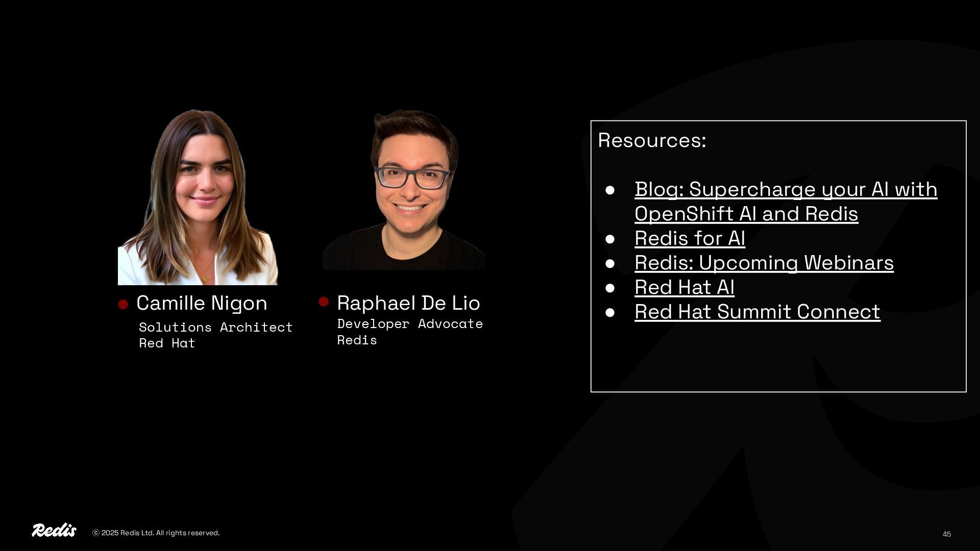 Red Hat Camille Nigon Developer Advocate Redis Raphael De Lio Resources: • Blog: Supercharge your AI with OpenShift AI and Redis • Redis for AI • Redis: Upcoming Webinars • Red Hat AI • Red Hat Summit Connect