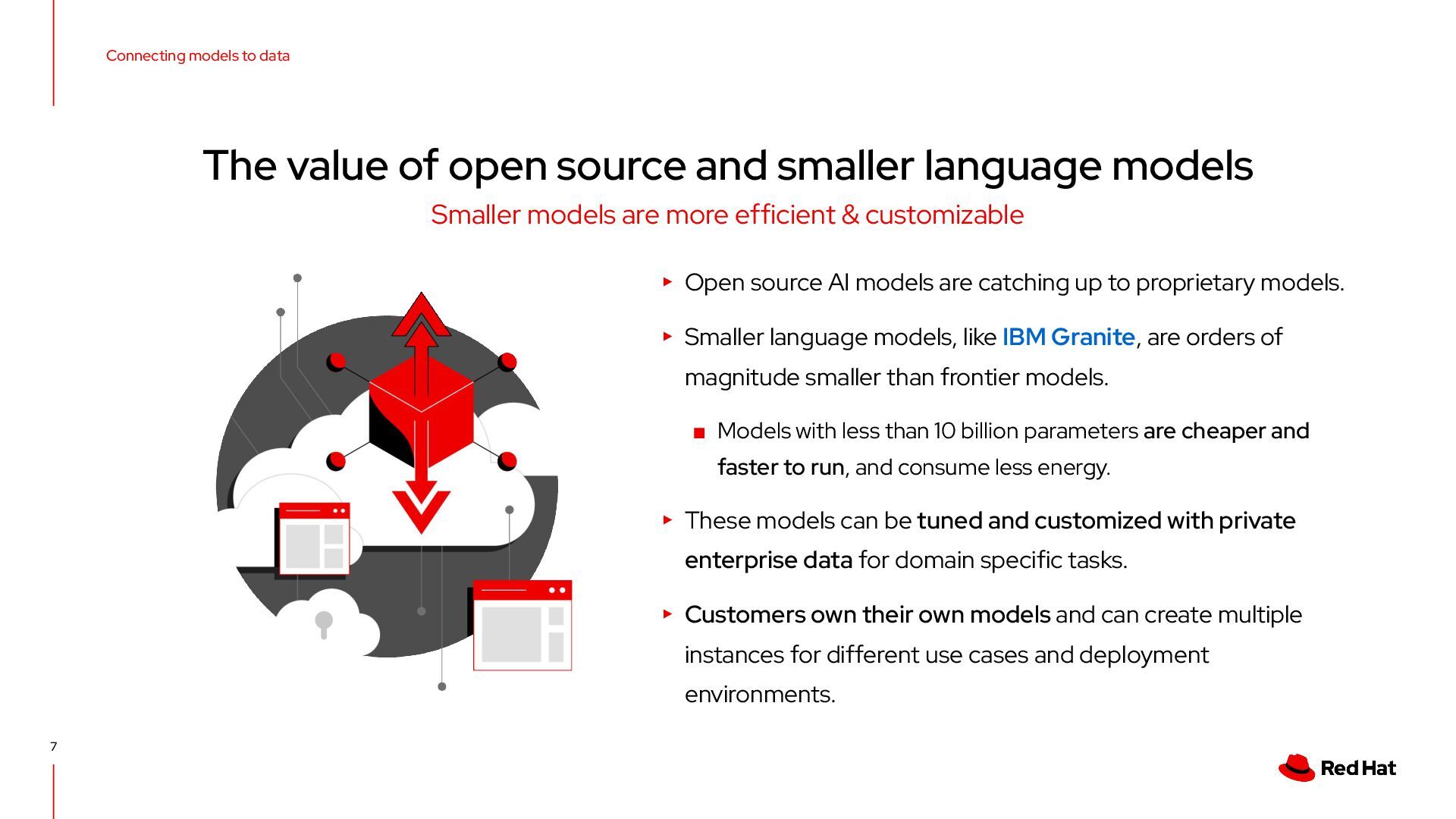 are catching up to proprietary models. ▸ Smaller language models, like IBM Granite, are orders of magnitude smaller than frontier models. ▪ Models with less than 10 billion parameters are cheaper and faster to run, and consume less energy. ▸ These models can be tuned and customized with private enterprise data for domain specific tasks. ▸ Customers own their own models and can create multiple instances for different use cases and deployment environments. The value of open source and smaller language models Smaller models are more efficient & customizable