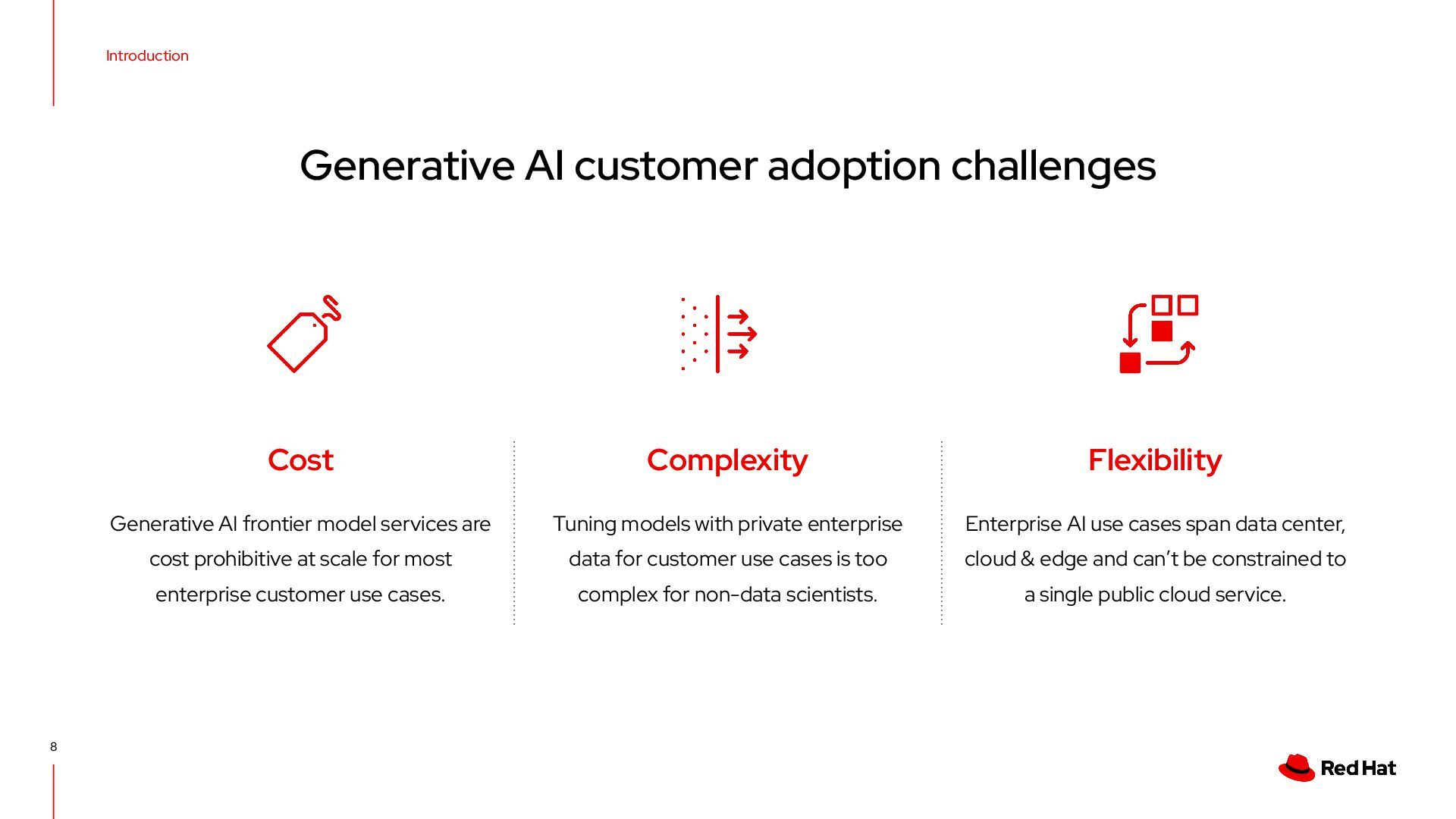 customer use cases is too complex for non-data scientists. Flexibility Enterprise AI use cases span data center, cloud & edge and can’t be constrained to a single public cloud service. Cost Generative AI frontier model services are cost prohibitive at scale for most enterprise customer use cases. Generative AI customer adoption challenges