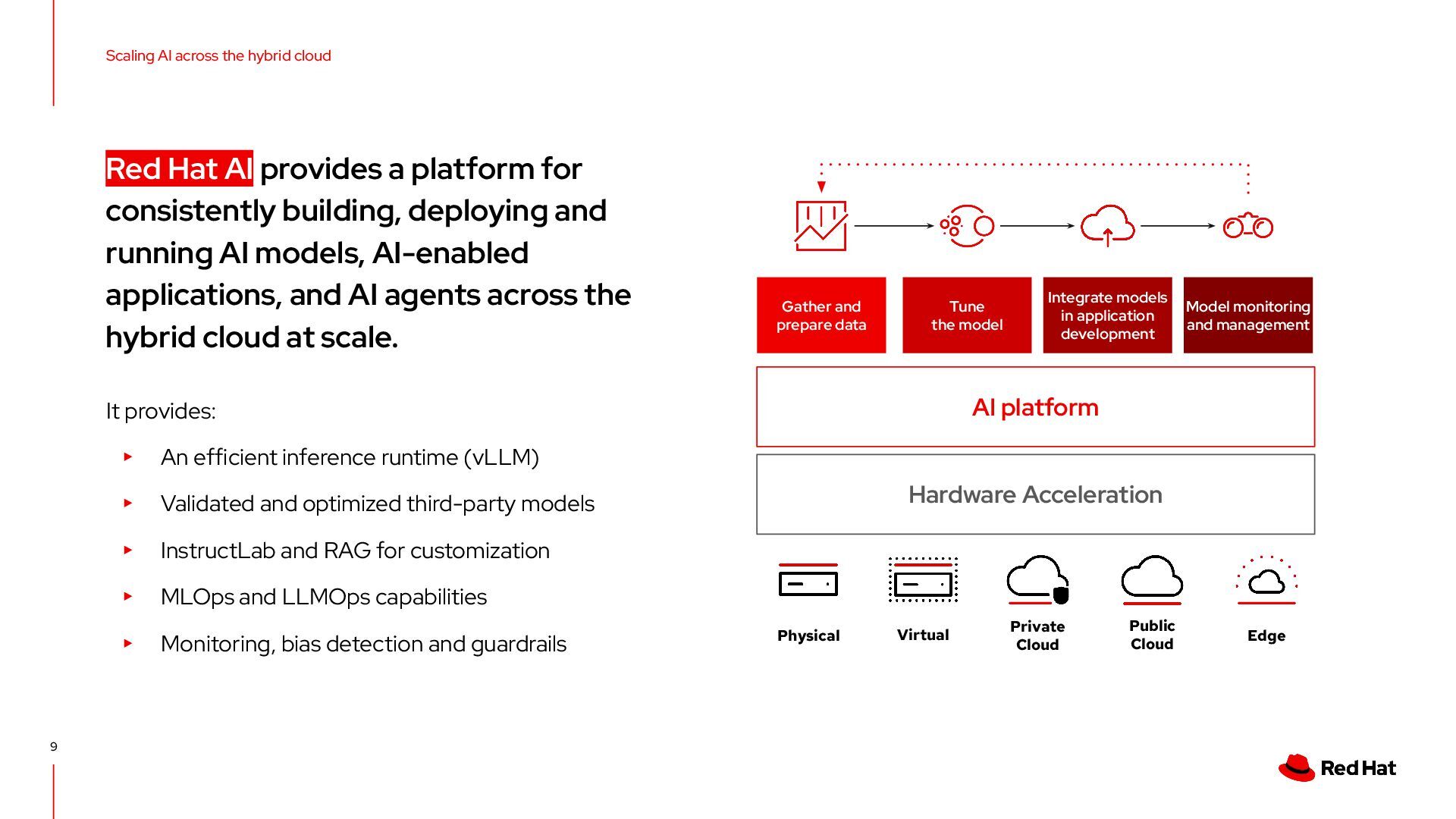 deploying and running AI models, AI-enabled applications, and AI agents across the hybrid cloud at scale. Scaling AI across the hybrid cloud Gather and prepare data Tune the model Model monitoring and management Integrate models in application development AI platform Edge Private Cloud Physical Virtual Public Cloud Hardware Acceleration It provides: ▸ An efficient inference runtime (vLLM) ▸ Validated and optimized third-party models ▸ InstructLab and RAG for customization ▸ MLOps and LLMOps capabilities ▸ Monitoring, bias detection and guardrails