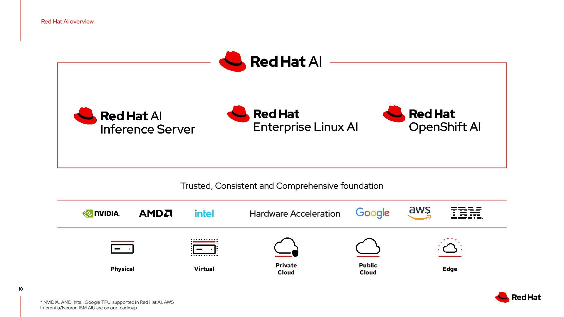 Edge Private Cloud Physical Virtual Public Cloud Hardware Acceleration * NVIDIA, AMD, Intel, Google TPU supported in Red Hat AI. AWS Inferentia/Neuron IBM AIU are on our roadmap