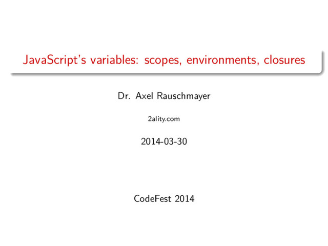 foo; function g(y, z) { var bar; } } Environment: field outer points to “surrounding” environment. Search environment chain for variables. Function: property [[Scope]] points to environment “in which” function was created. Function call: set up outer via [[Scope]]. Dr. Axel Rauschmayer (2ality.com) JavaScript’s variables 2014-03-30 14 / 32