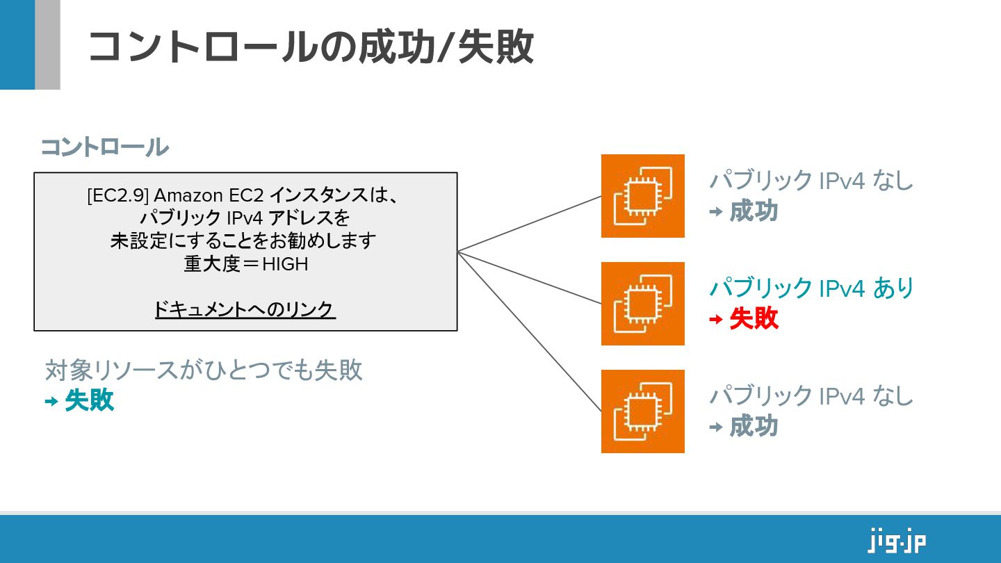 コントロールの成功/失敗 パブリック IPv4 なし → 成功 パブリック IPv4 あり → 失敗 パブリック IPv4 なし → 成功 対象リソースがひとつでも失敗 → 失敗 コントロール