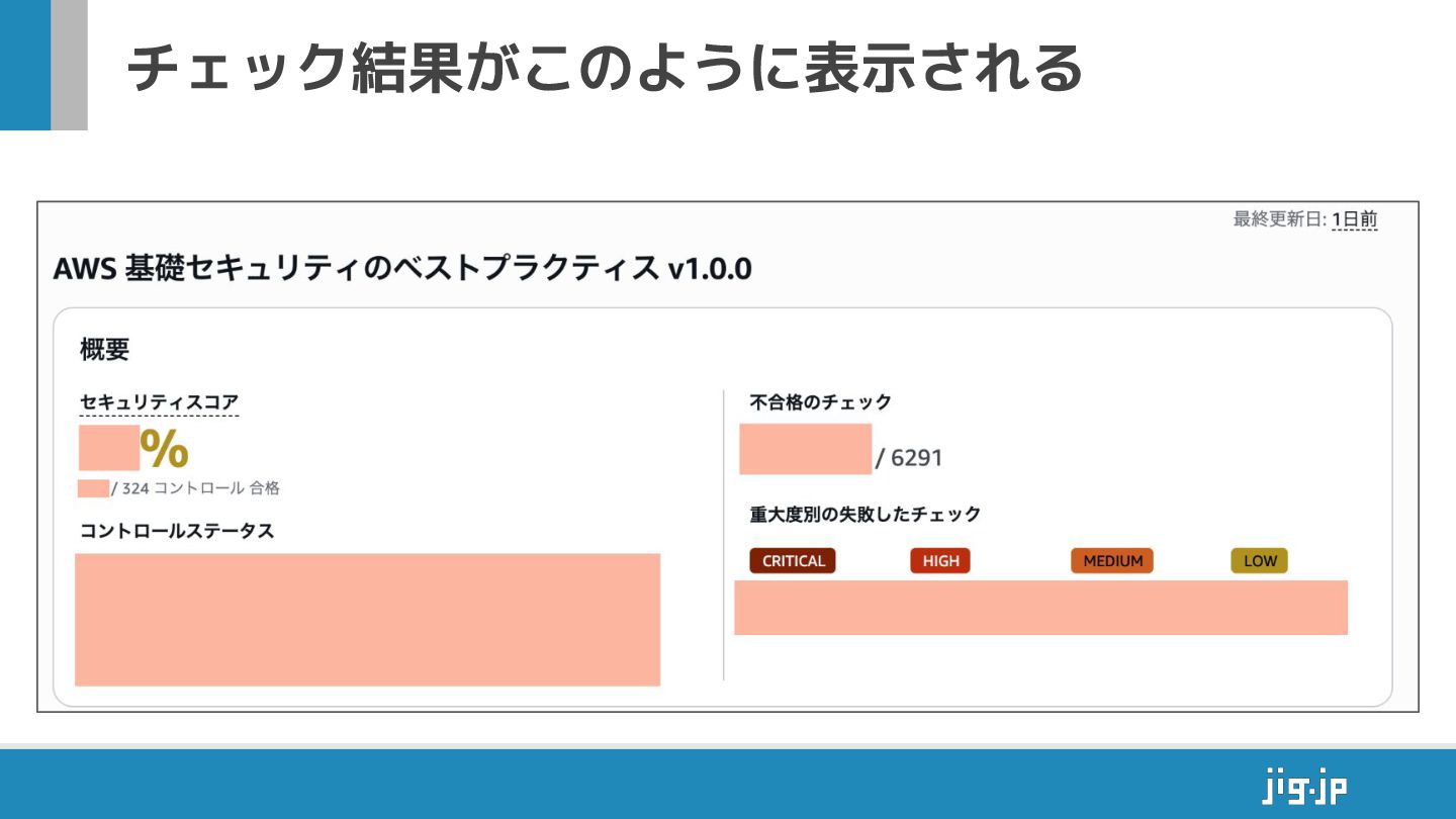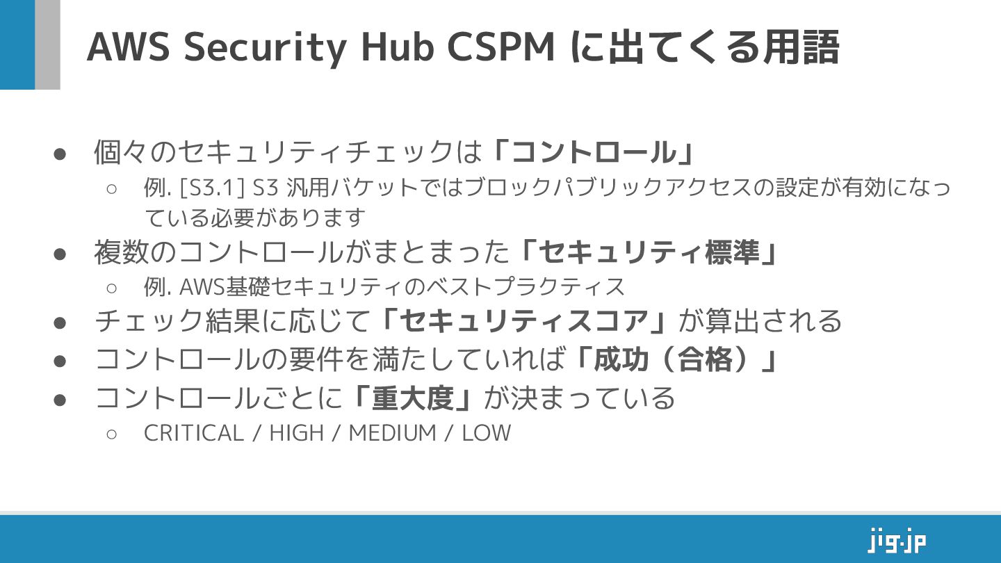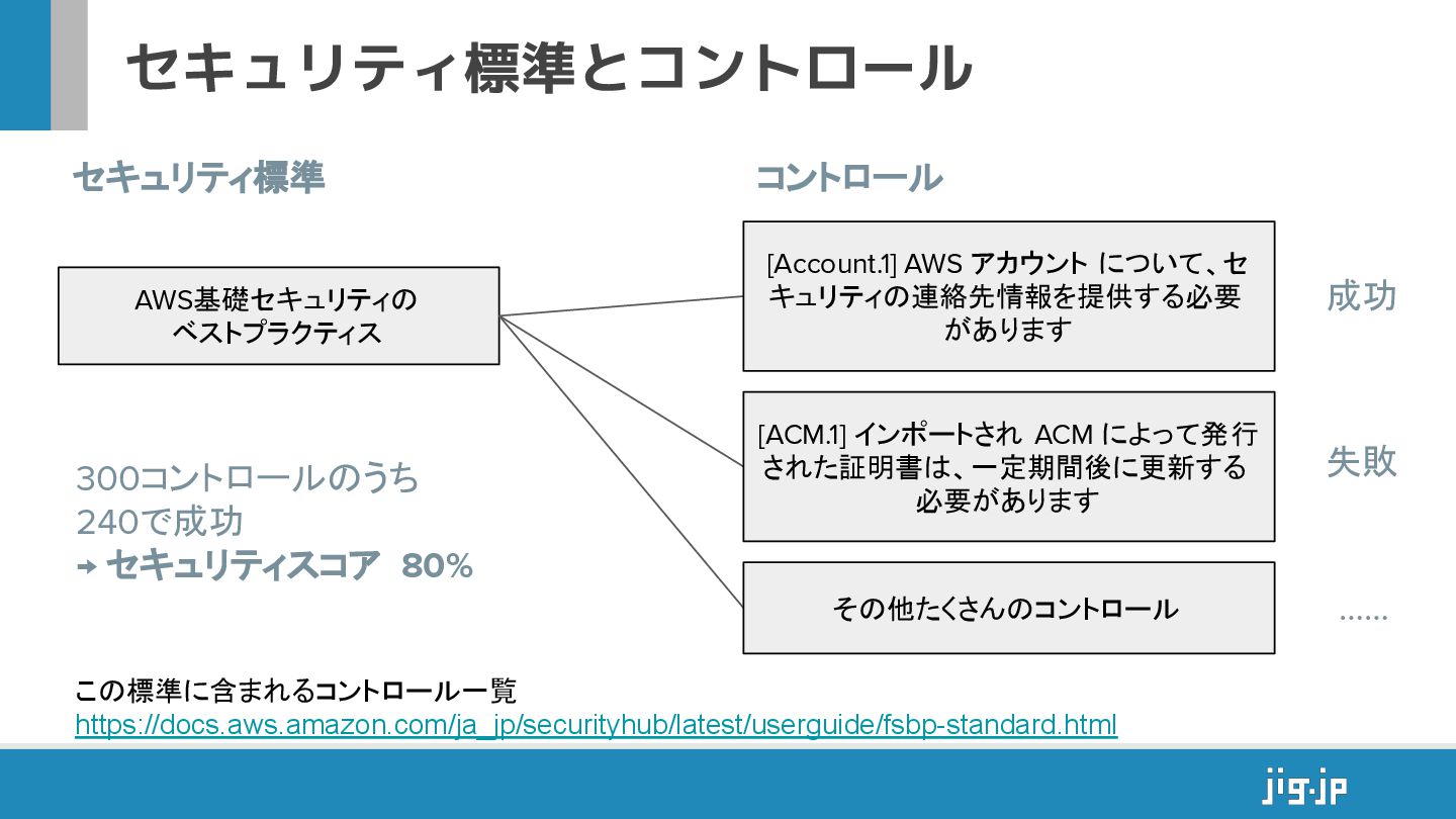 [S3.1] S3 汎用バケットではブロックパブリックアクセスの設定が有効になっ ている必要があります • 複数のコントロールがまとまった「セキュリティ標準」 ◦ 例. AWS基礎セキュリティのベストプラクティス • チェック結果に応じて「セキュリティスコア」が算出される • コントロールの要件を満たしていれば「成功(合格)」 • コントロールごとに「重大度」が決まっている ◦ CRITICAL / HIGH / MEDIUM / LOW