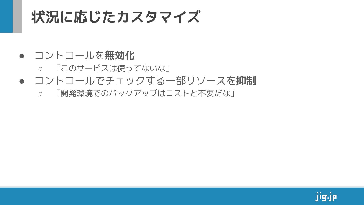 状況に応じたカスタマイズ • コントロールを無効化 ◦ 「このサービスは使ってないな」 • コントロールでチェックする一部リソースを抑制 ◦ 「開発環境でのバックアップはコストと不要だな」