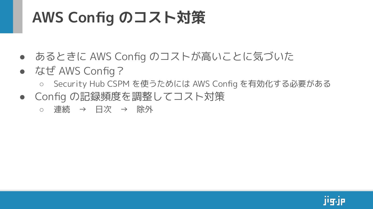 AWS Config? ◦ Security Hub CSPM を使うためには AWS Config を有効化する必要がある • Config の記録頻度を調整してコスト対策 ◦ 連続 → 日次 → 除外