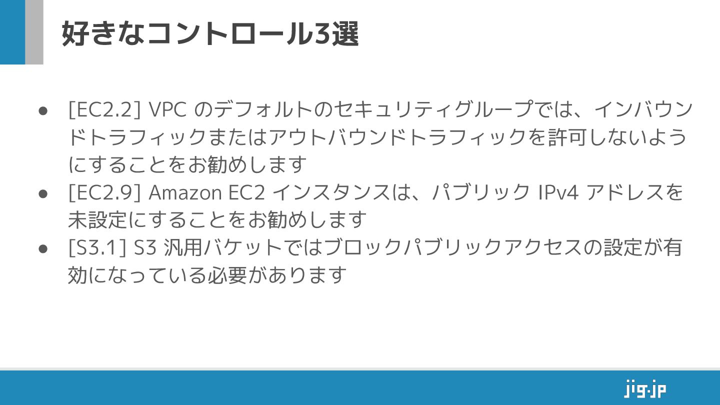 好 なコントロール3選 • [EC2.2] VPC のデフォルトのセキュリティグループでは、インバウン ドトラフィックまたはアウトバウンドトラフィックを許可しないよう にすることをお勧めします • [EC2.9]