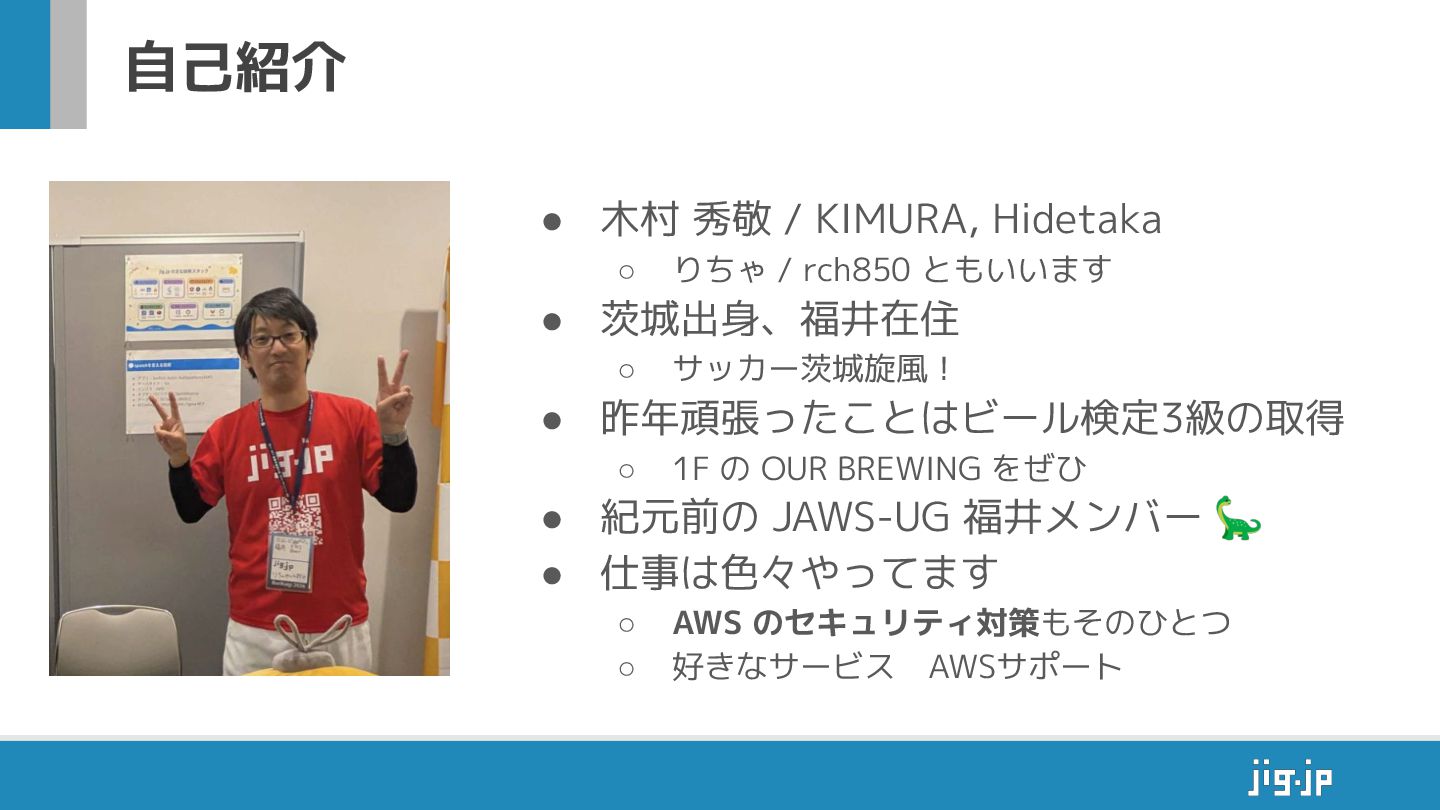 ともいいます • 茨城出身、福井在住 ◦ サッカー茨城旋風! • 昨年頑張ったことはビール検定3級の取得 ◦ 1F の OUR BREWING をぜひ • 紀元前の JAWS-UG 福井メンバー 🦕 • 仕事は色々やってます ◦ AWS のセキュリティ対策もそのひとつ ◦ 好きなサービス AWSサポート 自己紹介