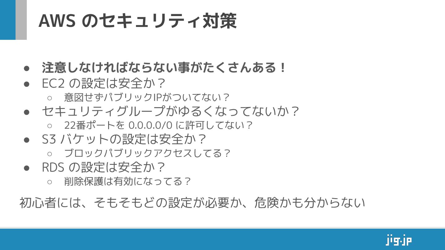 • 注意しなければならない事 た さんある! • EC2 の設定は安全か? ◦ 意図せずパブリックIPがついてない? •
