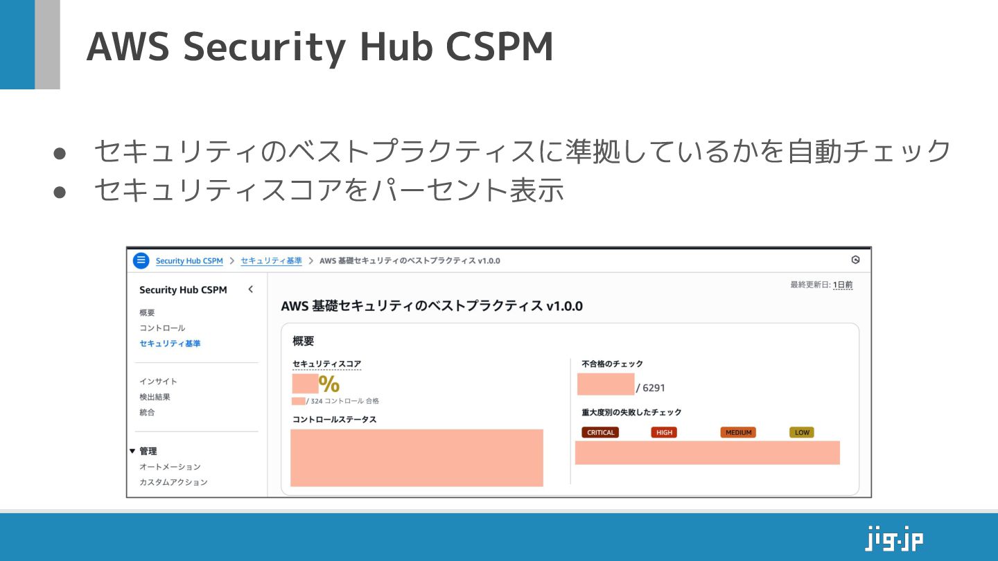 AWS Security Hub CSPM • セキュリティのベストプラクティスに準拠しているかを自動チェック • セキュリティスコアをパーセント表示