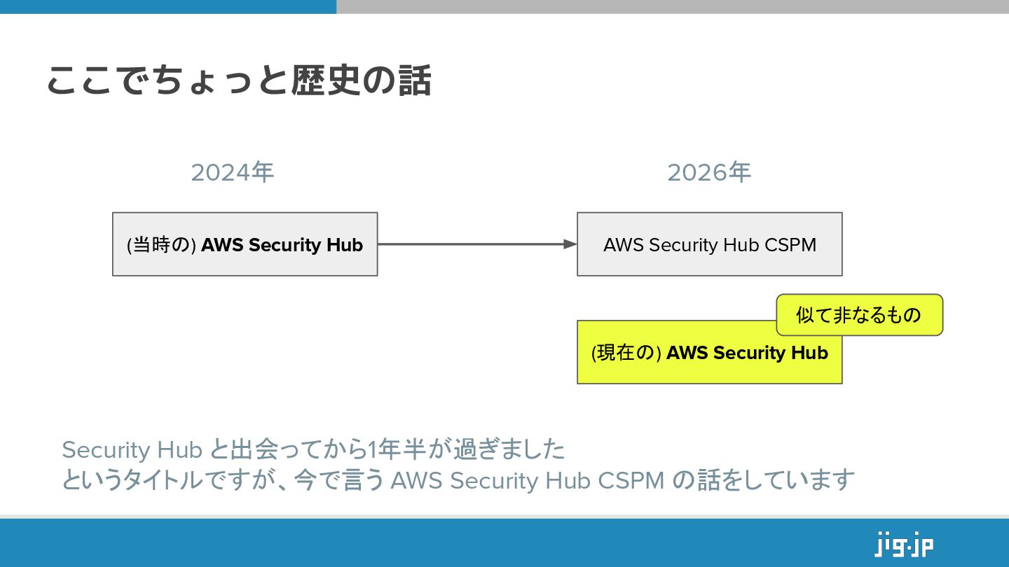 (現在の) AWS Security Hub 2026年 Security Hub と出会ってから1年半が過ぎました というタイトルですが、今で言う AWS Security Hub CSPM の話をしています 似て非なるもの