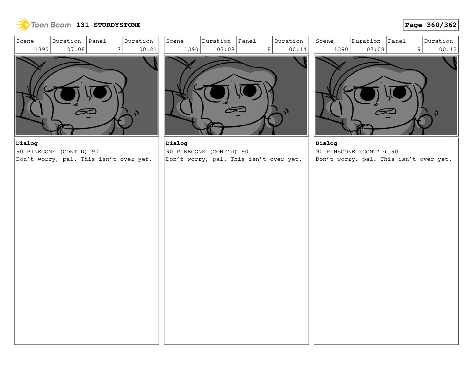 PINECONE (CONT'D) 90 Don’t worry, pal. This isn’t over yet. Scene 1390 Duration 07:08 Panel 8 Duration 00:14 Dialog 90 PINECONE (CONT'D) 90 Don’t worry, pal. This isn’t over yet. Scene 1390 Duration 07:08 Panel 9 Duration 00:12 Dialog 90 PINECONE (CONT'D) 90 Don’t worry, pal. This isn’t over yet. 131 STURDYSTONE Page 360/362