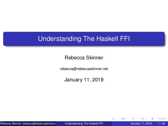 need to be aware of before we get started: You may need to account for Endianness of data Fundamental types may have different bit widths between Haskell and C, e.g. Ints The width of some types may be architecture dependant Pointer operations are impure Rebecca Skinner ([email protected]) Understanding The Haskell FFI January 11, 2019 25 / 42